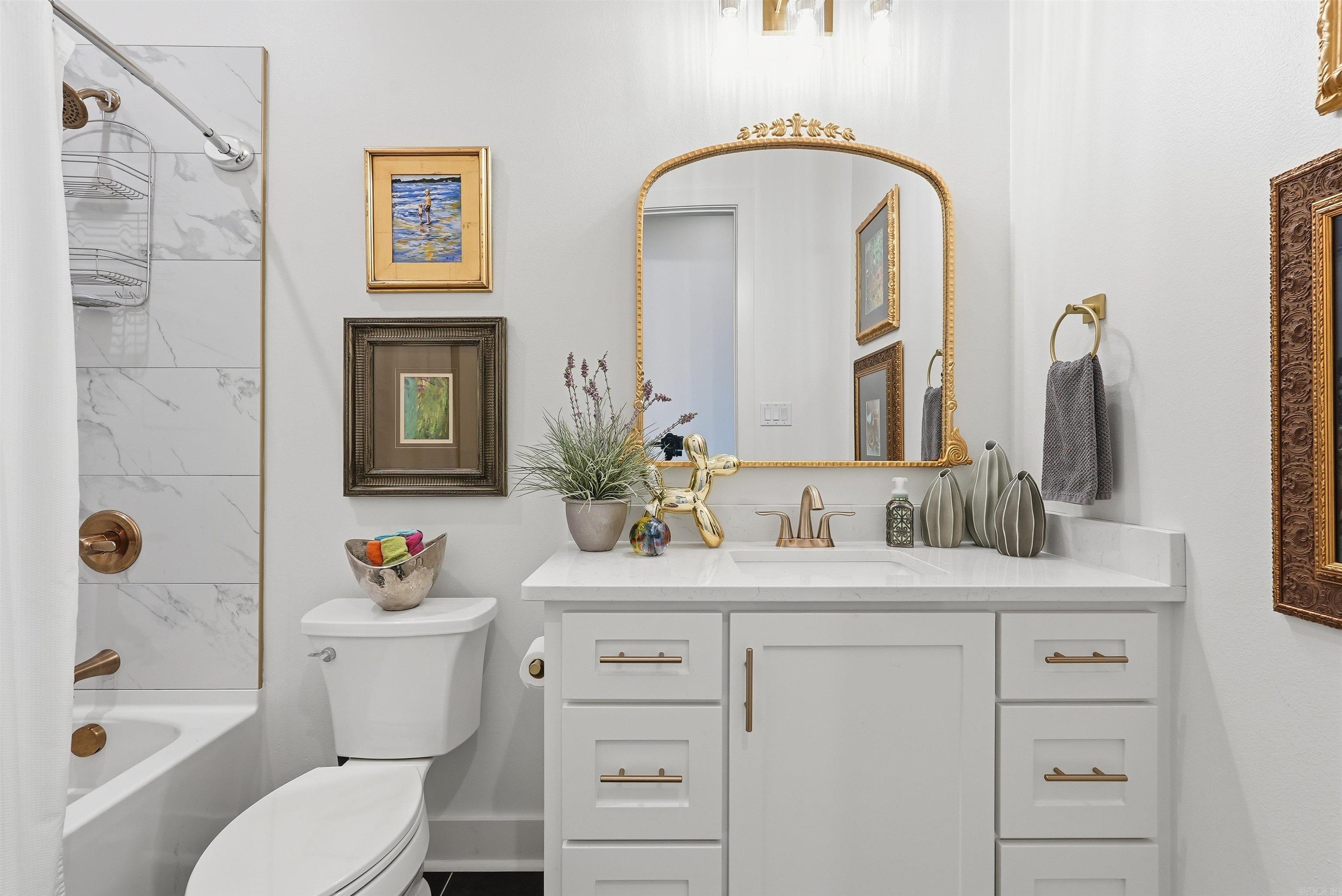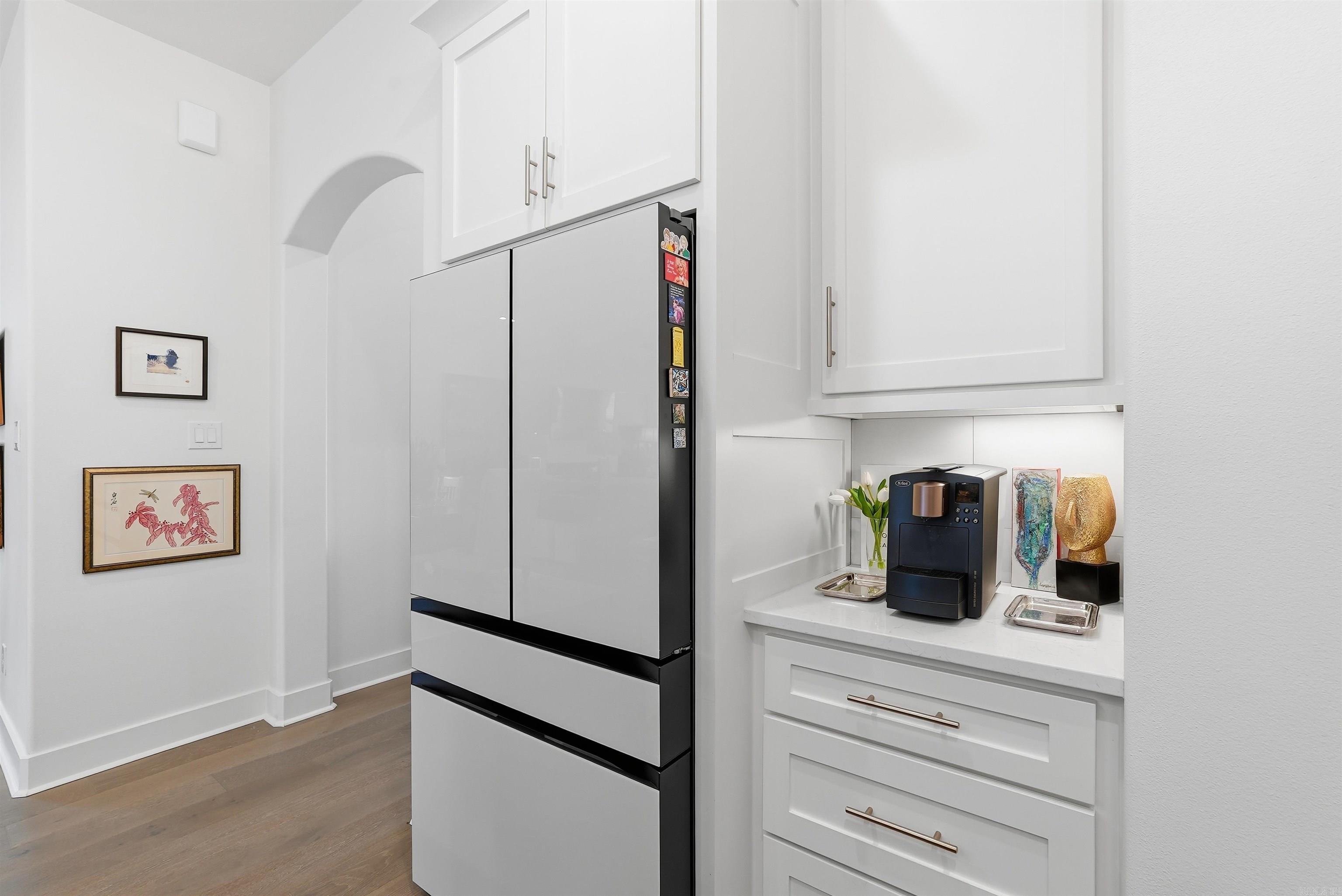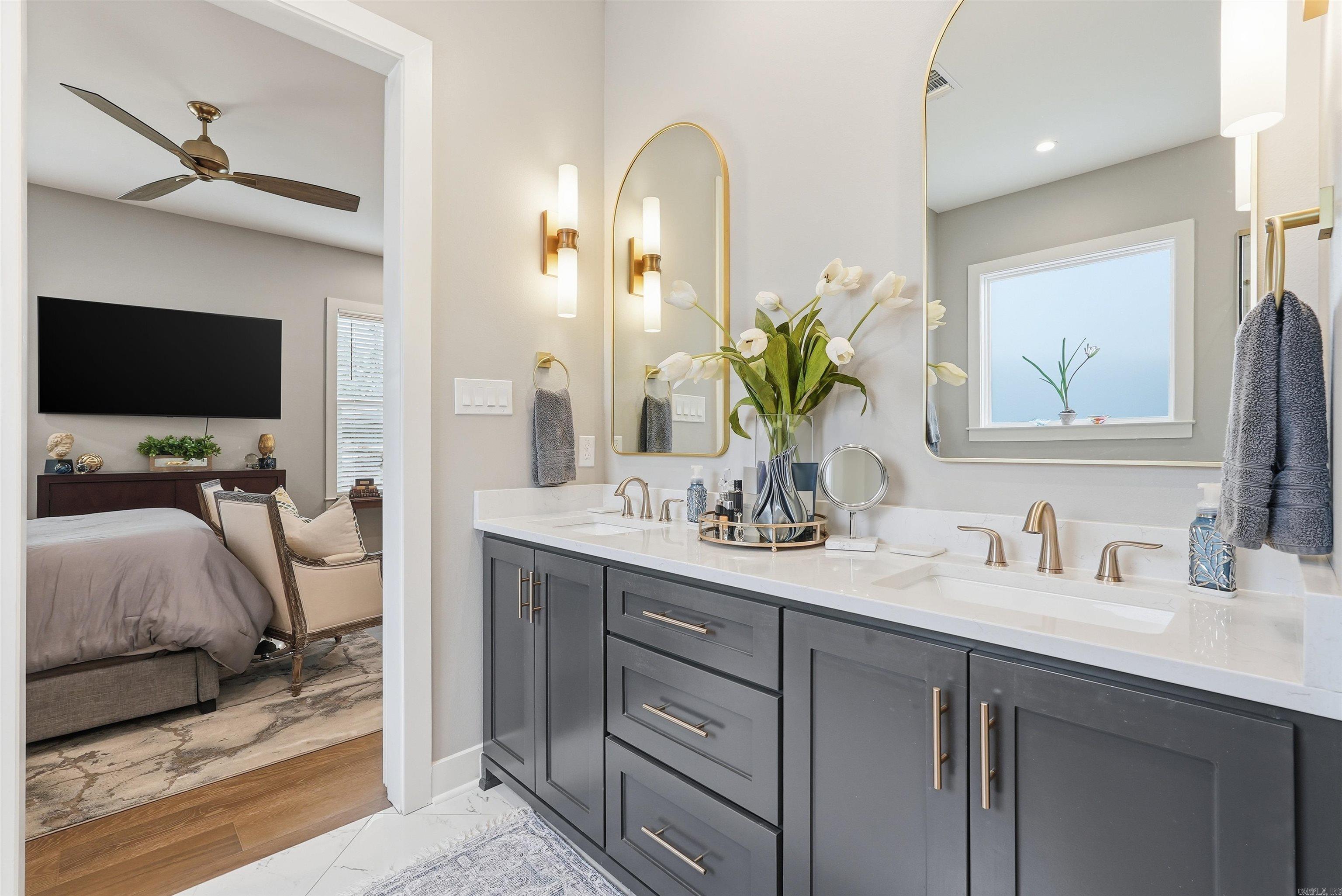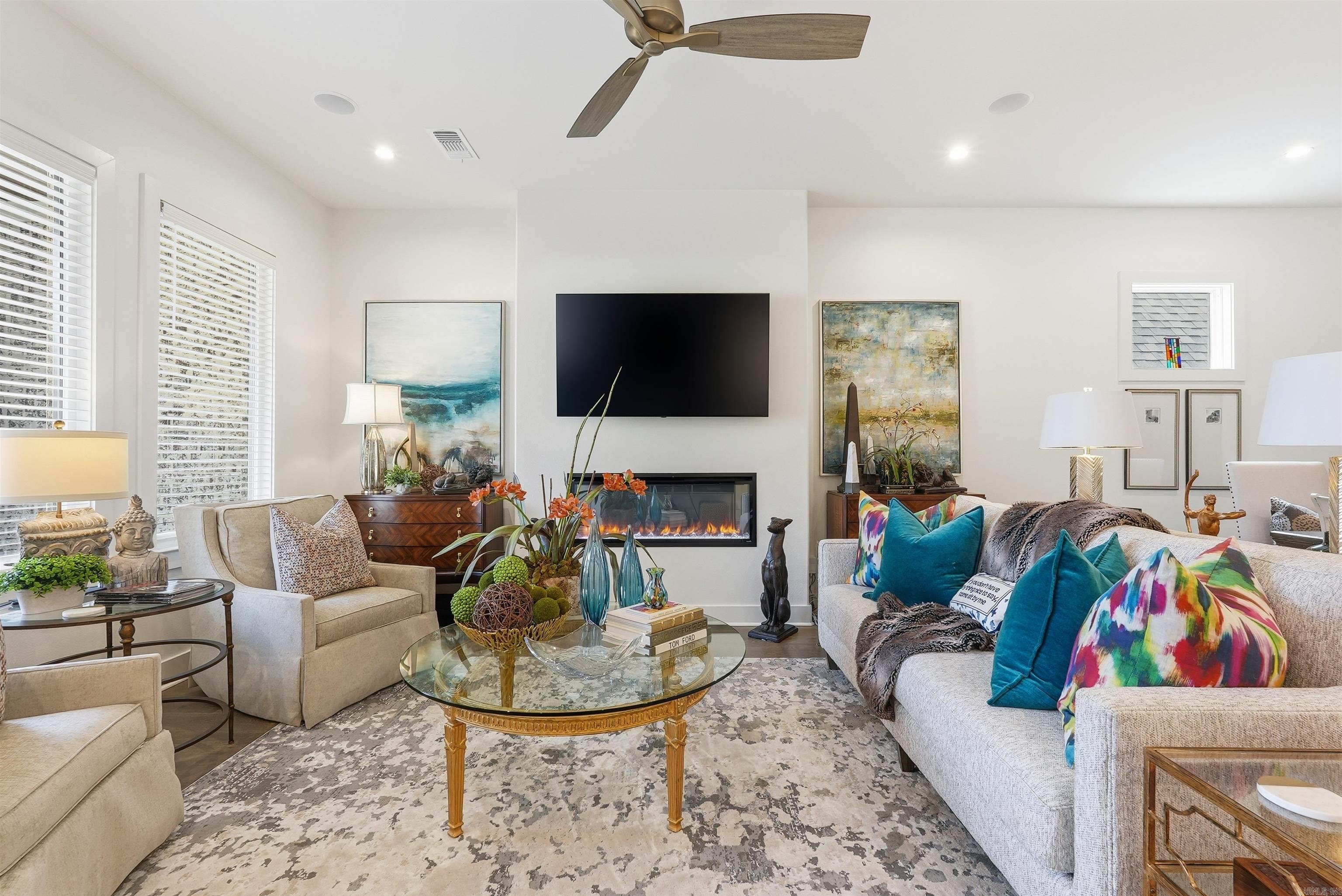 Inside, the home features white plank oak hardwood flooring, ten-foot ceilings, and graceful arched entryways that set a warm, elegant tone. Just off the entry, two guest bedrooms share a hall bathroom featuring designer mirrors, dual sinks, and a tub-shower combination. The spacious great room is anchored by a color-controlled LED fireplace and flows seamlessly into the dining room and chef’s gourmet kitchen. The kitchen is equipped with high-end appliances including a Bosch gas range, vent hood, GE profile dishwasher and microwave, along with stunning quartz countertops and bar seating. Surround sound and a designated dining area enhance the open concept layout, ideal for entertaining and everyday living. A conveniently located laundry room just off the kitchen provides additional storage and functionality.