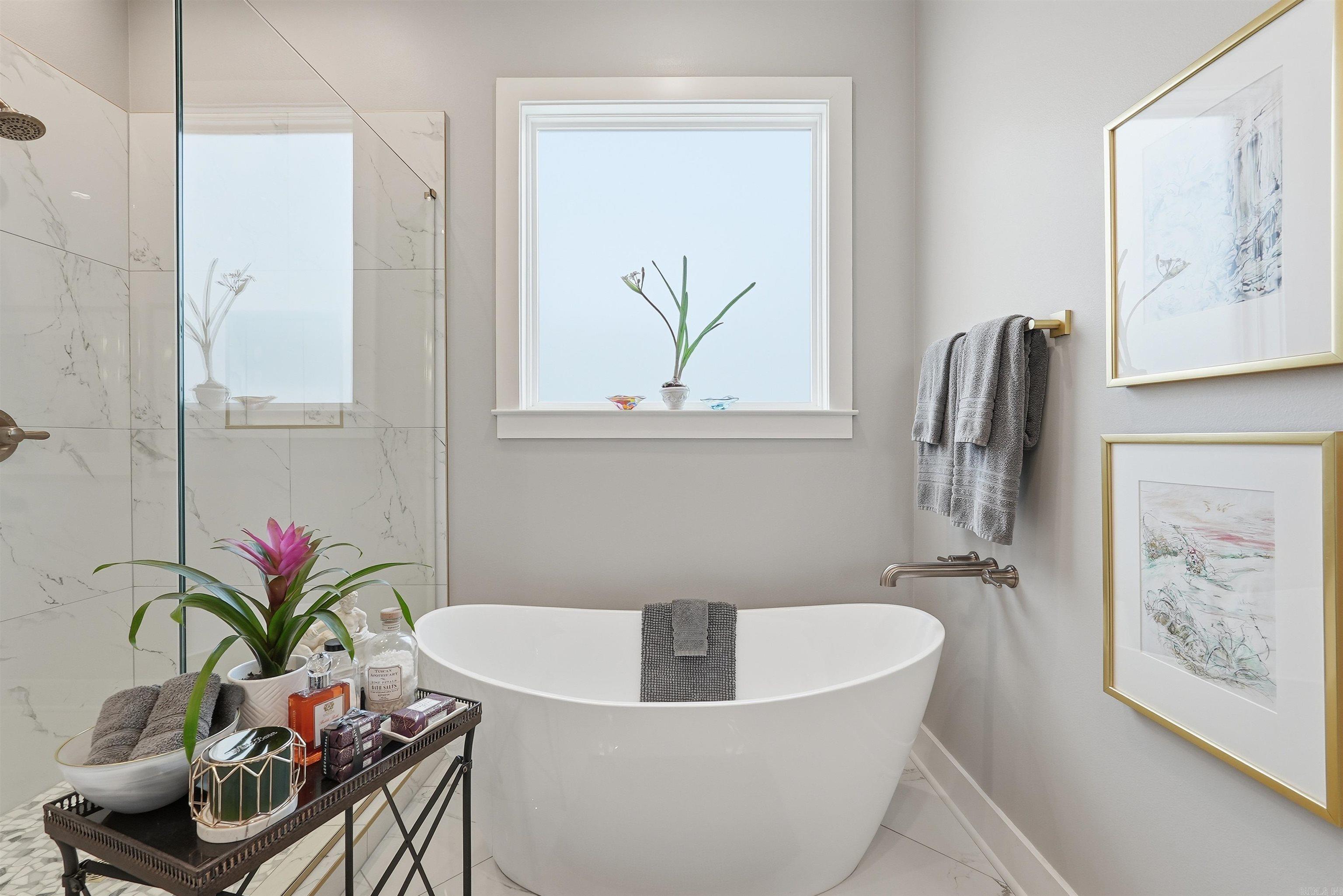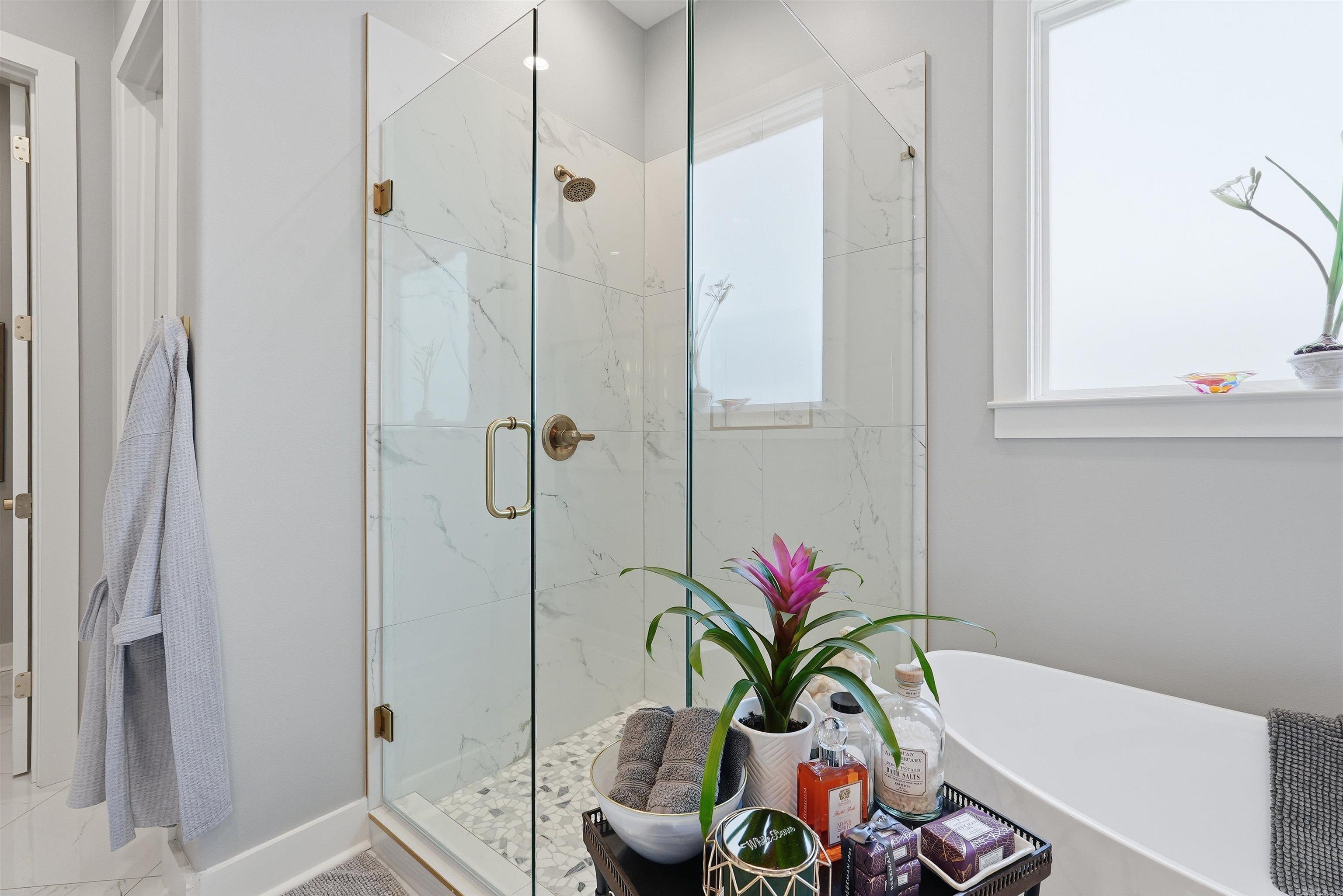 The primary suite offers a peaceful retreat with hardwood floors, a generous walk-in closet, and a spa inspired bathroom featuring dual sinks, a freestanding soaking tub, a large frameless glass shower, and a private water closet. The covered patio overlooks a fenced backyard framed by evergreen trees, creating a private outdoor oasis.