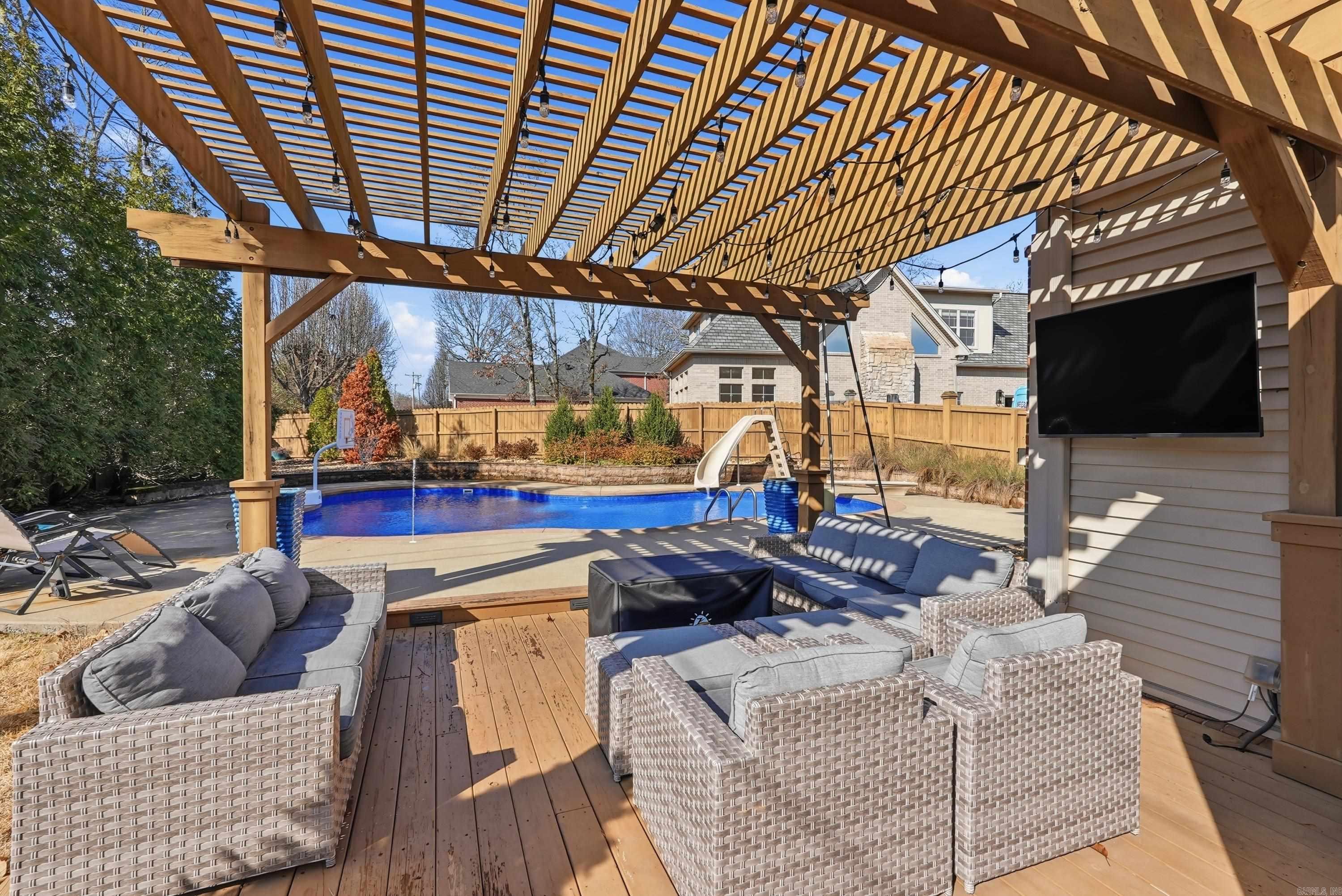 Discover an extraordinary opportunity to own a property in the heart of Overbrook, where the backyard is a true showstopper. This private oasis features a lagoon-shaped saltwater pool that exudes a resort-like ambiance, perfect for both entertaining and everyday enjoyment. The salt-water pool is equipped with a new liner (2025), diving board, slide, water features, pool heater, and Wi-Fi controlled LED lighting, ensuring a luxurious experience. The expansive deck and pergola overlook a meticulously manicured Zoysia lawn and professionally landscaped grounds, creating an elevated yet relaxed atmosphere. Inside, the home boasts 3,852 square feet of living space, including 4 bedrooms and 3.5 baths. The main level houses two bedrooms, one of which is a spacious primary suite. Significant updates include a new 30-year architectural roof (December 2024), all new windows (2019), granite countertops, updated fixtures and hardware, fresh interior paint, solid white oak hardwood floors, and newer HVAC systems. Additional features include a gas fireplace, sprinkler and security systems, along with access to Overbrook amenities--including a community pool, tennis courts, trails, and playground.