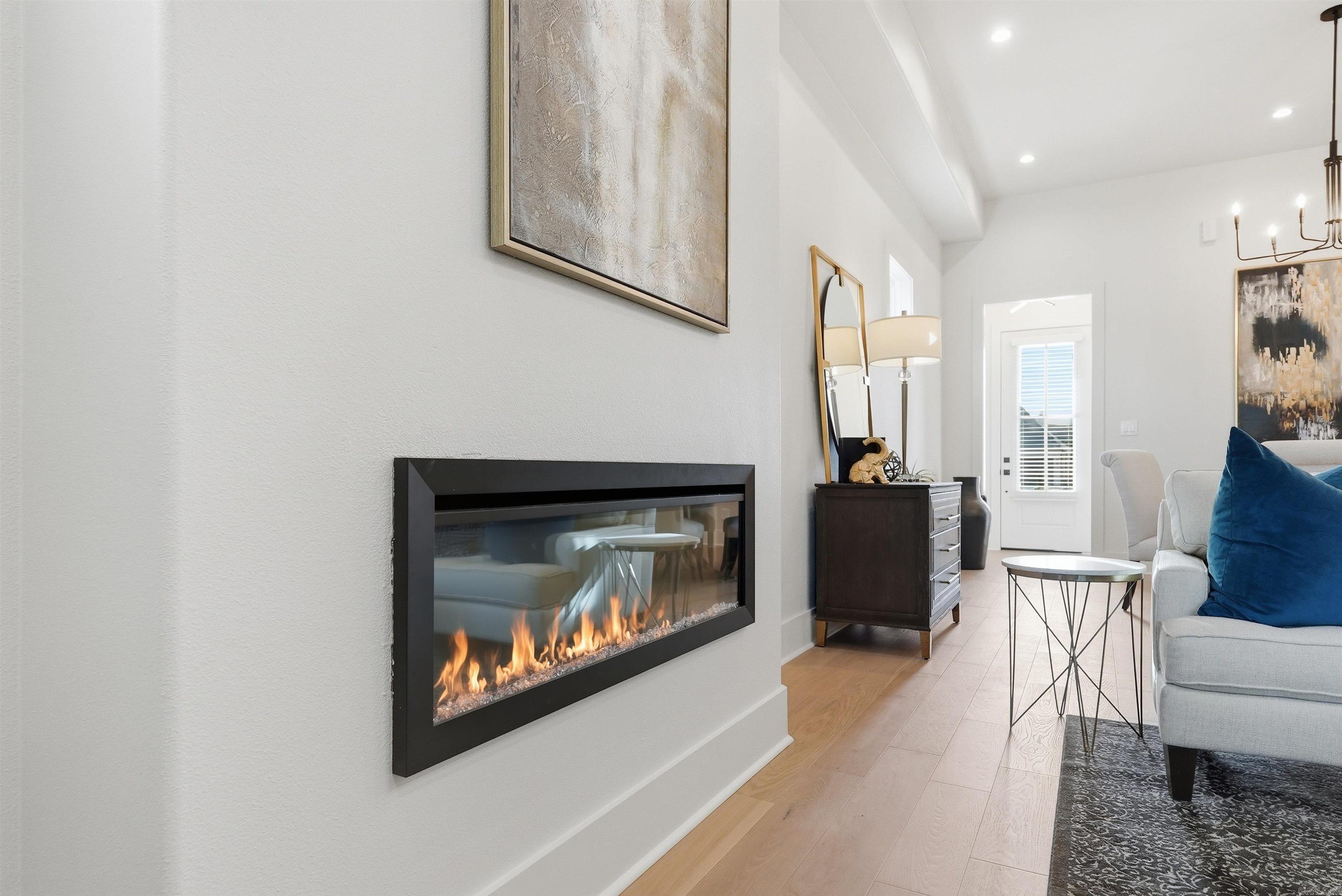 Step inside to discover wide-plank white oak flooring, soaring 12-foot ceilings in the main living area, and an open layout designed for both comfort and entertaining. The spacious great room features an electric LED fireplace that creates a warm focal point while adding a sleek, contemporary element to the space. The kitchen is designed with both style and functionality in mind, showcasing a large island, vent hood, and all GE appliances, creating the perfect space for cooking, gathering, and everyday living.