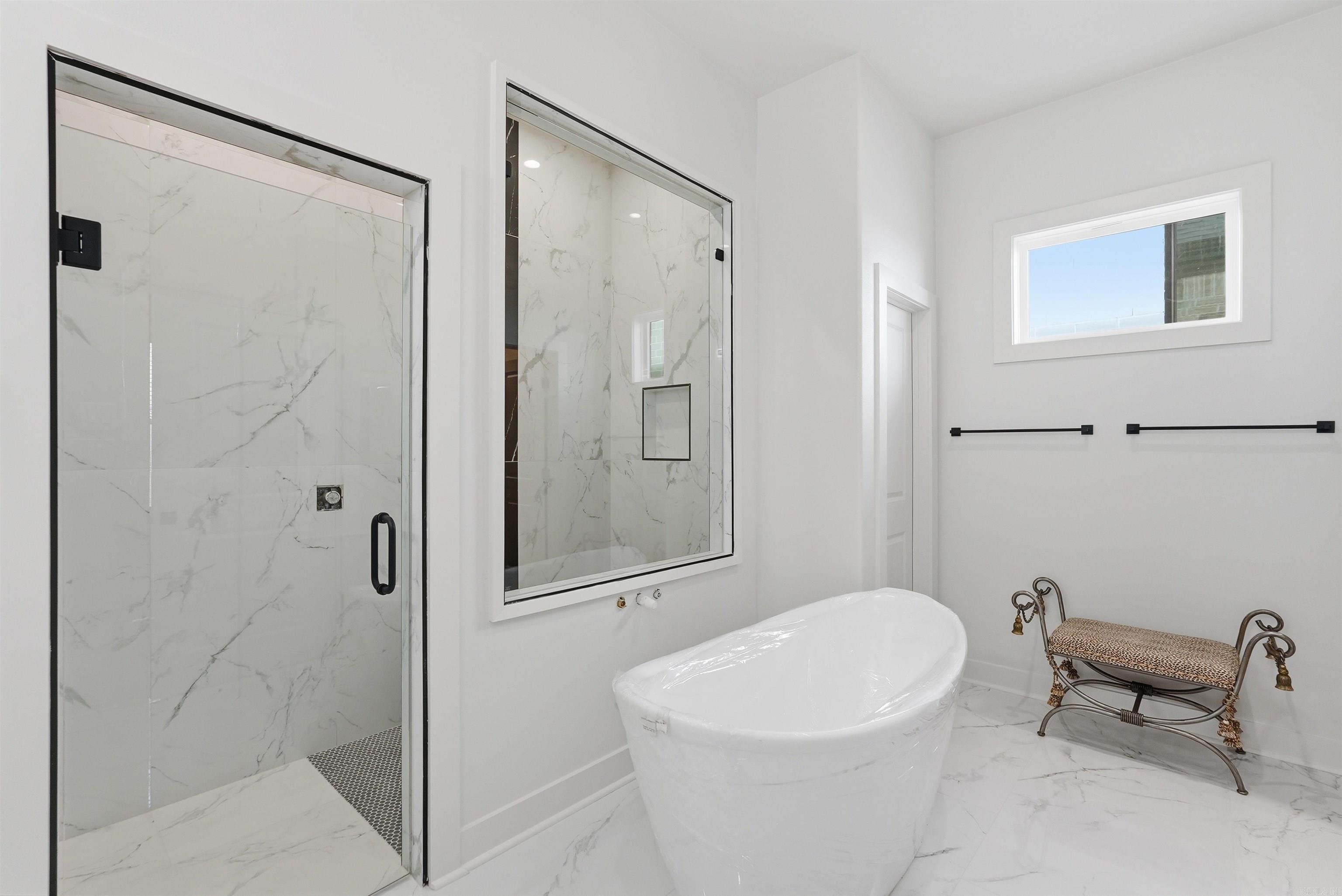 The home offers a thoughtfully designed split floor plan for added privacy. The private primary suite is tucked away, creating a peaceful retreat within the home. The primary suite features a luxurious master bathroom, designed with comfort and style in mind and offering a spa-like atmosphere for everyday relaxation. Two secondary bedrooms feature hardwood flooring in one bedroom, carpet in the other bedroom and share access to a well-appointed hall bathroom.