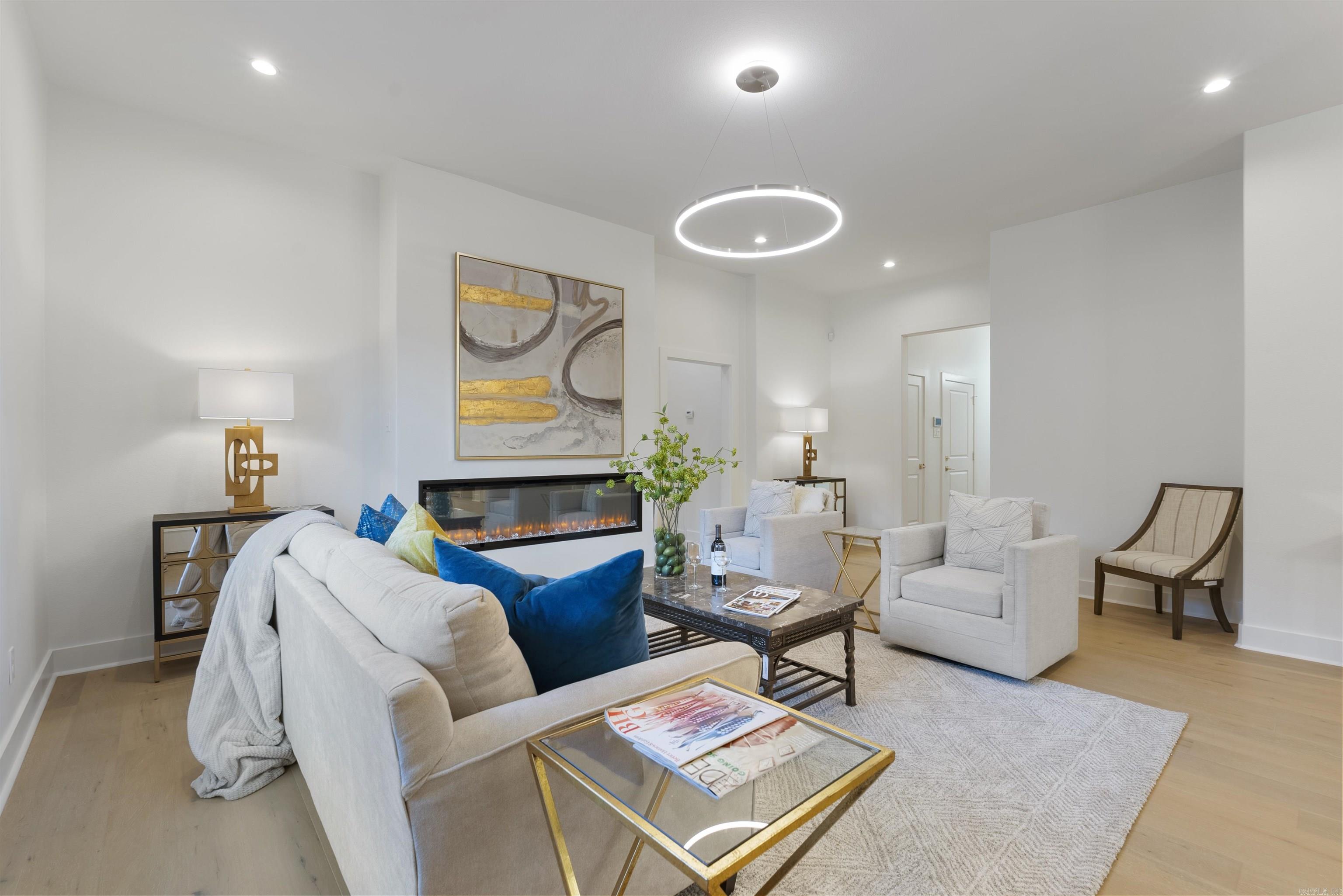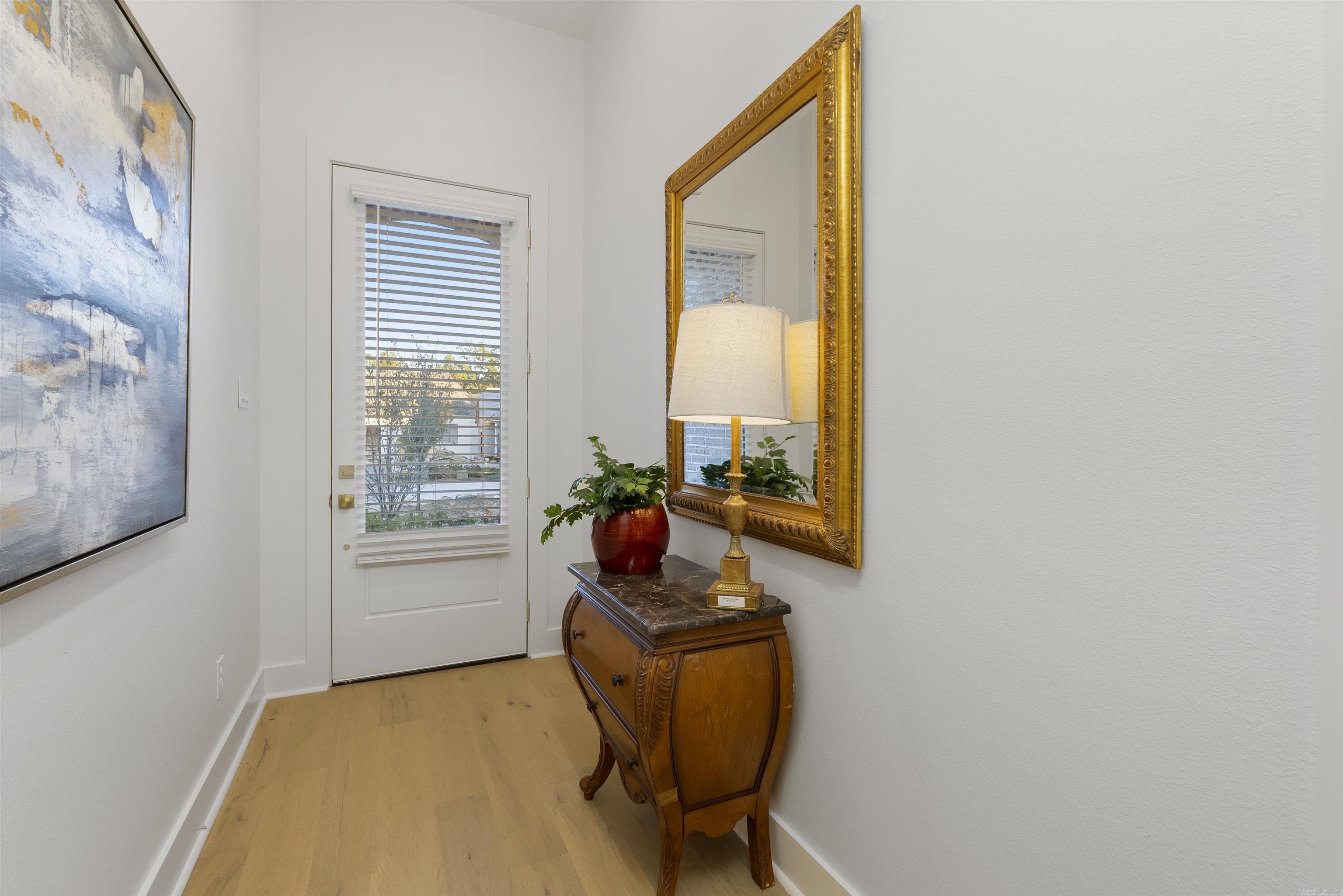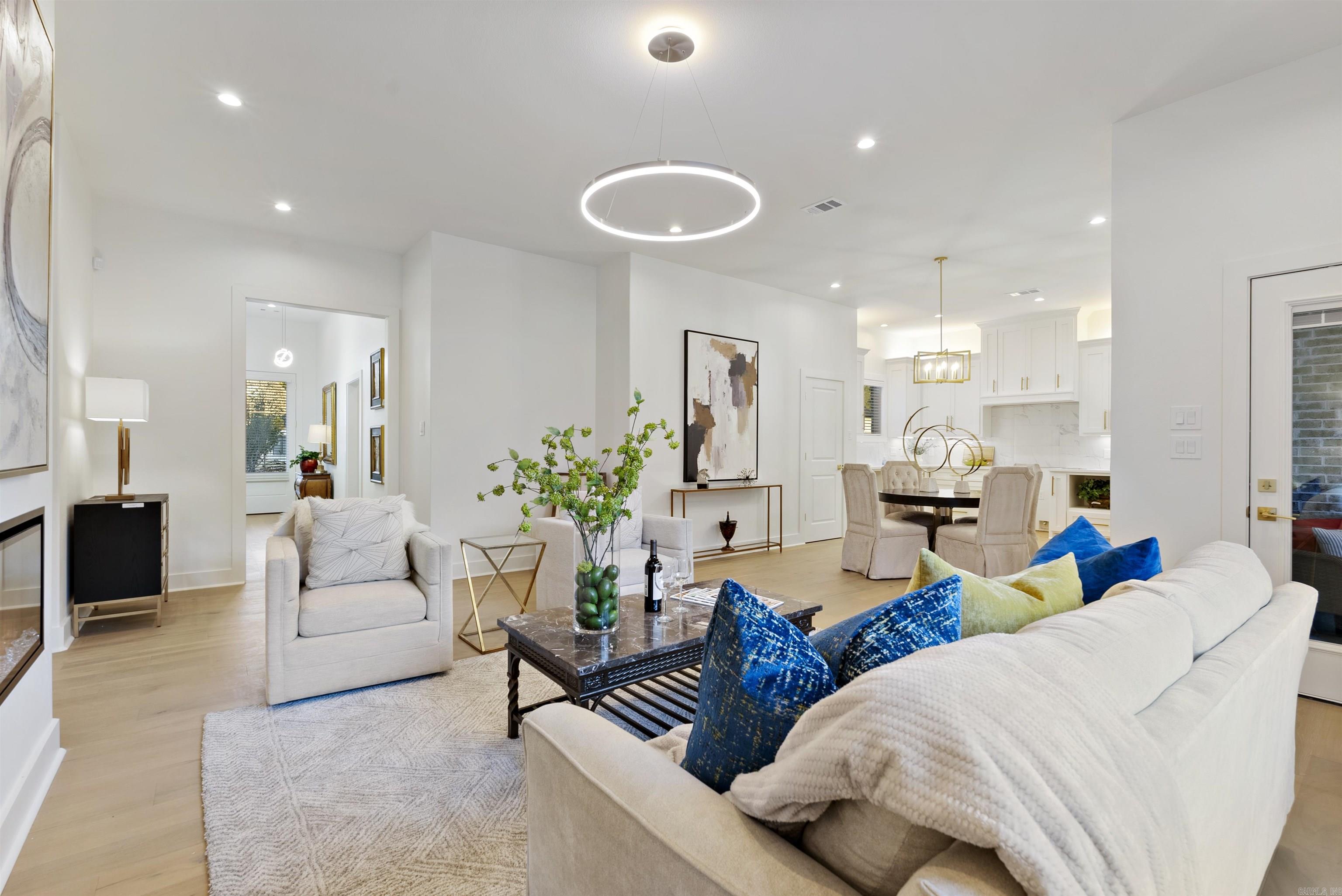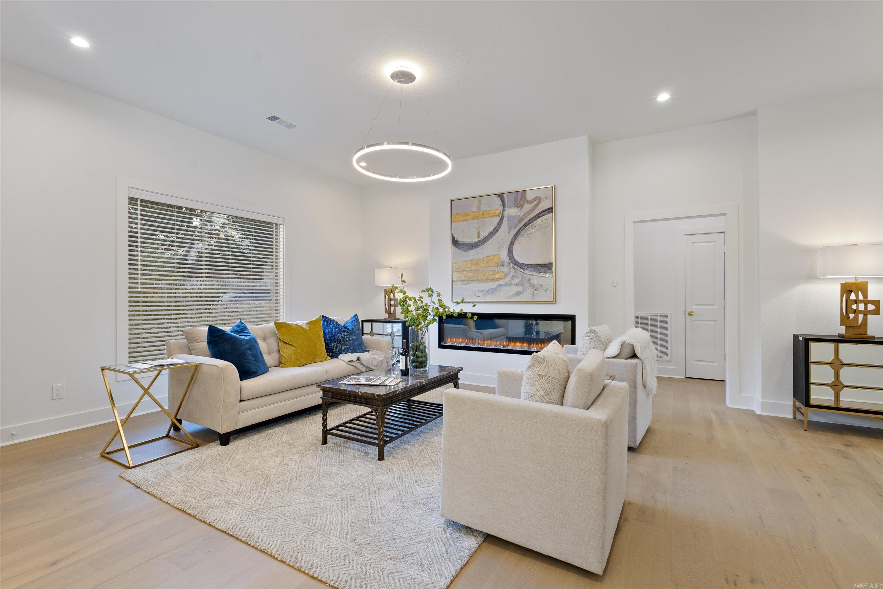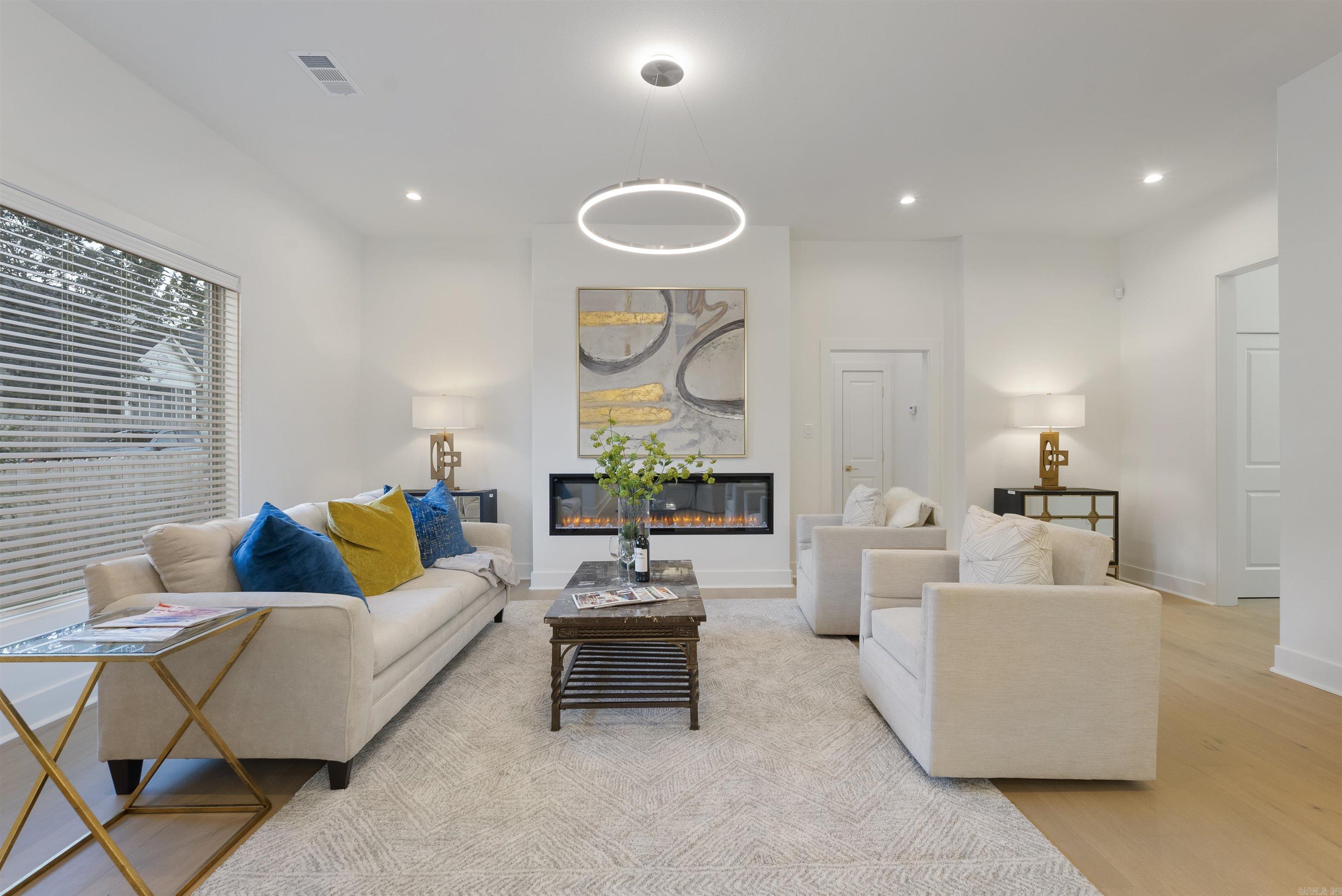 Step inside to discover white wide plank oak hardwood flooring, soaring ceilings, and expansive windows that flood the home with natural light. The open layout creates an airy and inviting atmosphere, perfect for both relaxing and entertaining. Just off the entry are two guest bedrooms with a shared hall bathroom. The spacious great room features a color-controlled LED fireplace and opens seamlessly into the chef’s kitchen, complete with GE Profile appliances including a gas range, Energy Star dishwasher, vent hood (to be installed), and microwave. A designated dining area flows easily into the private courtyard and fenced backyard, ideal for outdoor gatherings and grilling. The laundry room, located just off the kitchen, offers additional storage space for everyday functionality. The privately situated primary suite is a true retreat, featuring hardwood floors, a spa-like bathroom, and a walk-in closet. The en-suite bath includes dual sinks, a freestanding soaking tub, a walk-in shower, and a private water closet.