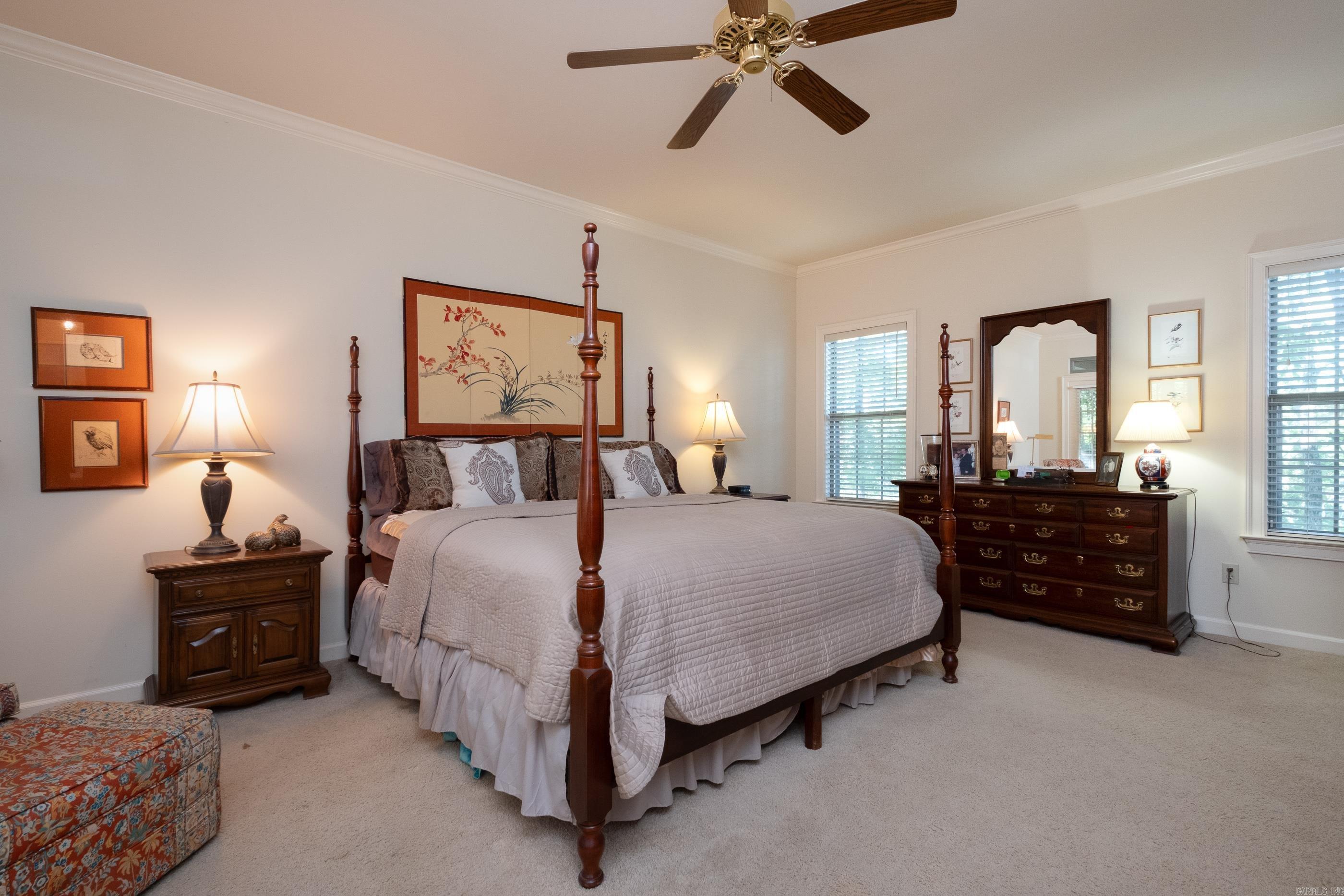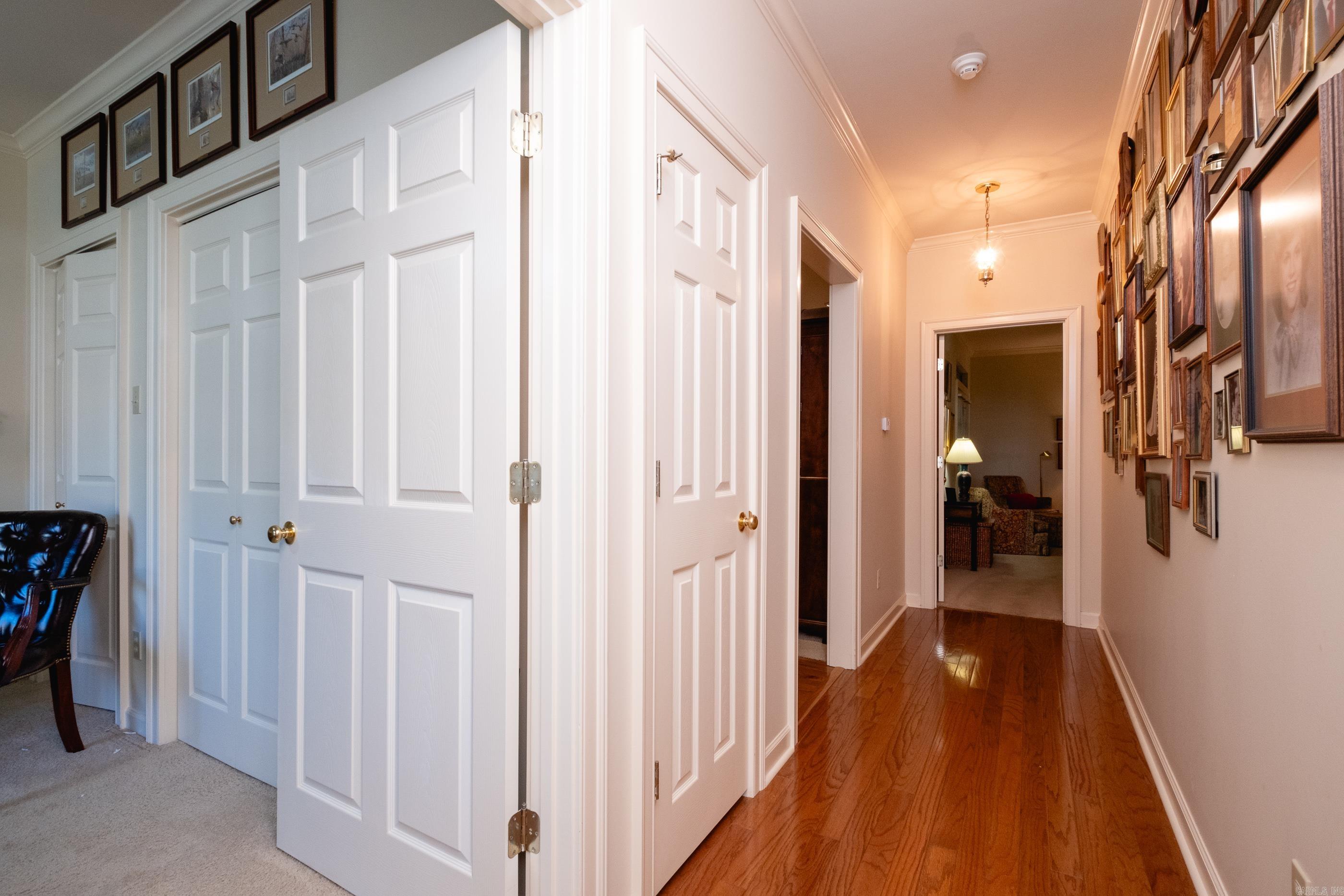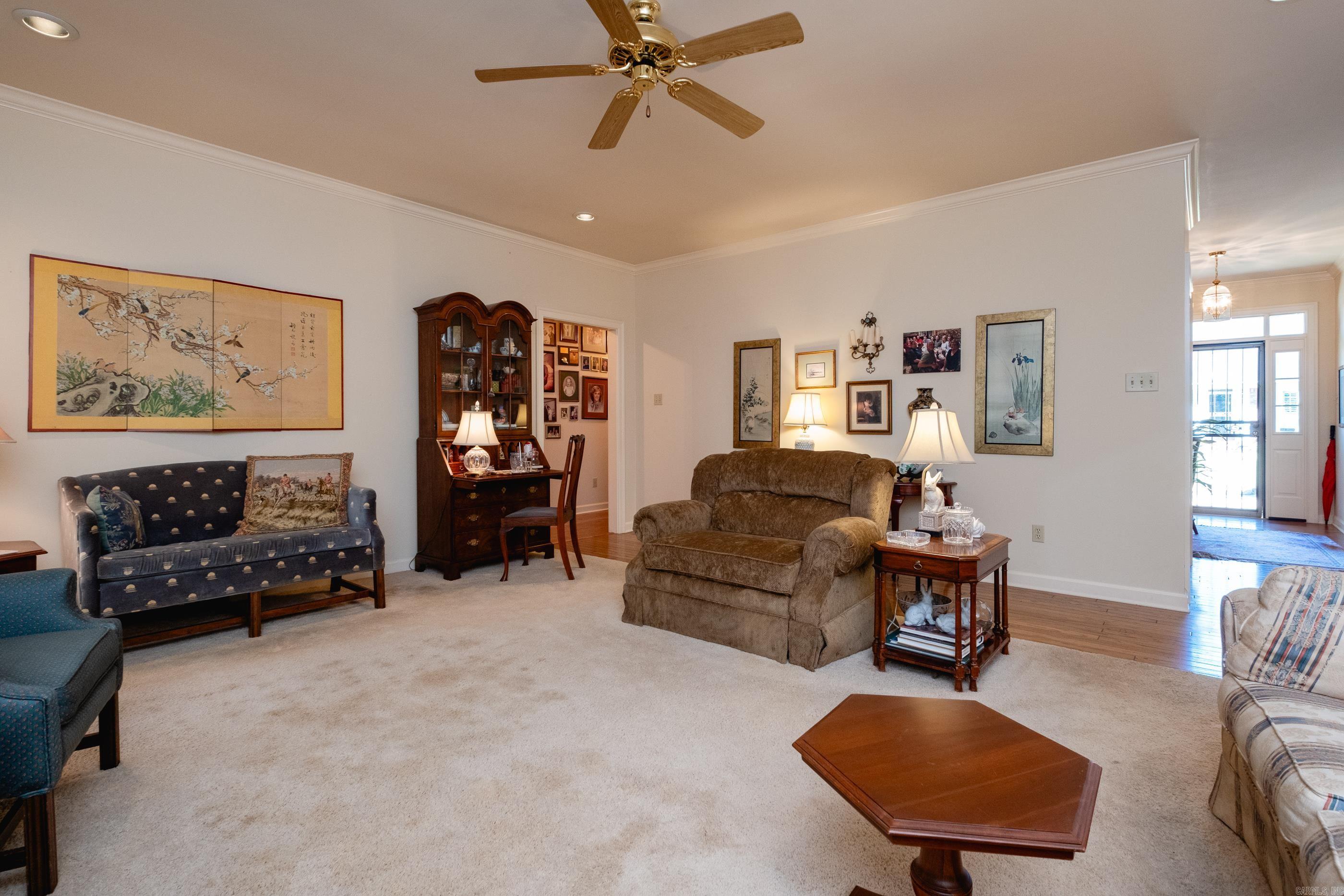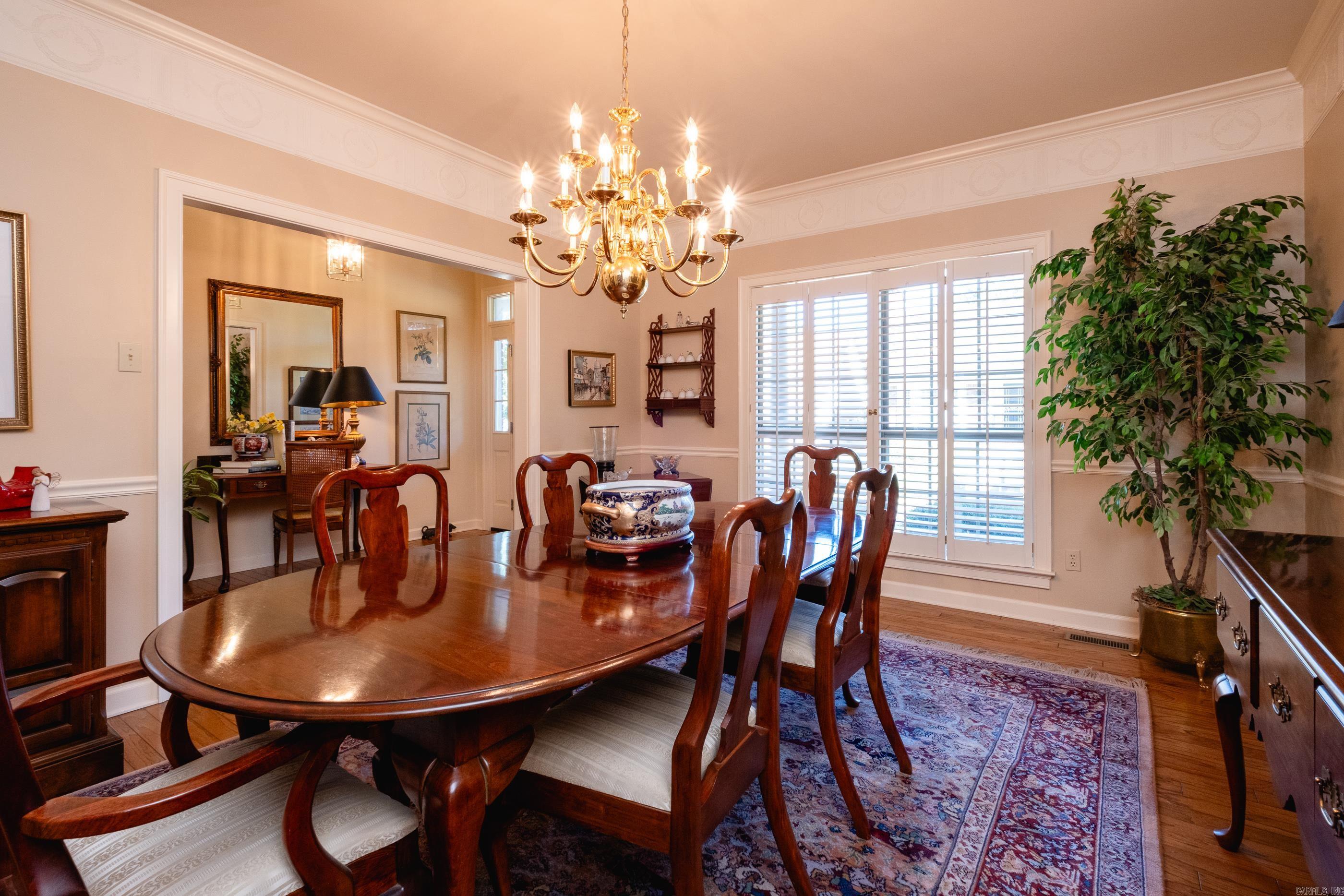 Absolutely wonderful one level house in desirable Hunter's Cove Subdivision sits on a corner lot & offers so many amenities. This one owner custom built home boasts 3 bedrooms, 2 full baths and one half bath. As soon as you step in the entry you can see this house is truly special. The dining room is so elegant and is capped off with a Lincrusta border and connects to the kitchen with a butler's pantry. The kitchen has a center island, lots of prep space, newer SS appliances, pantry, built in desk, and eat in breakfast area that opens to the den. Back steps lead to a park like patio. The primary suite is spacious with a spa like bath AND 3 walk in closets. So many other extras - laundry room w/ sink, 9 foot ceilings throughout, lots of closets for storage, ceiling fans, hall guest bath & one bedroom with wider doorways for handicap access, large storage area under house with single garage door & back door, floor attic (easy access) with wider staircase off the garage. Come see today!!