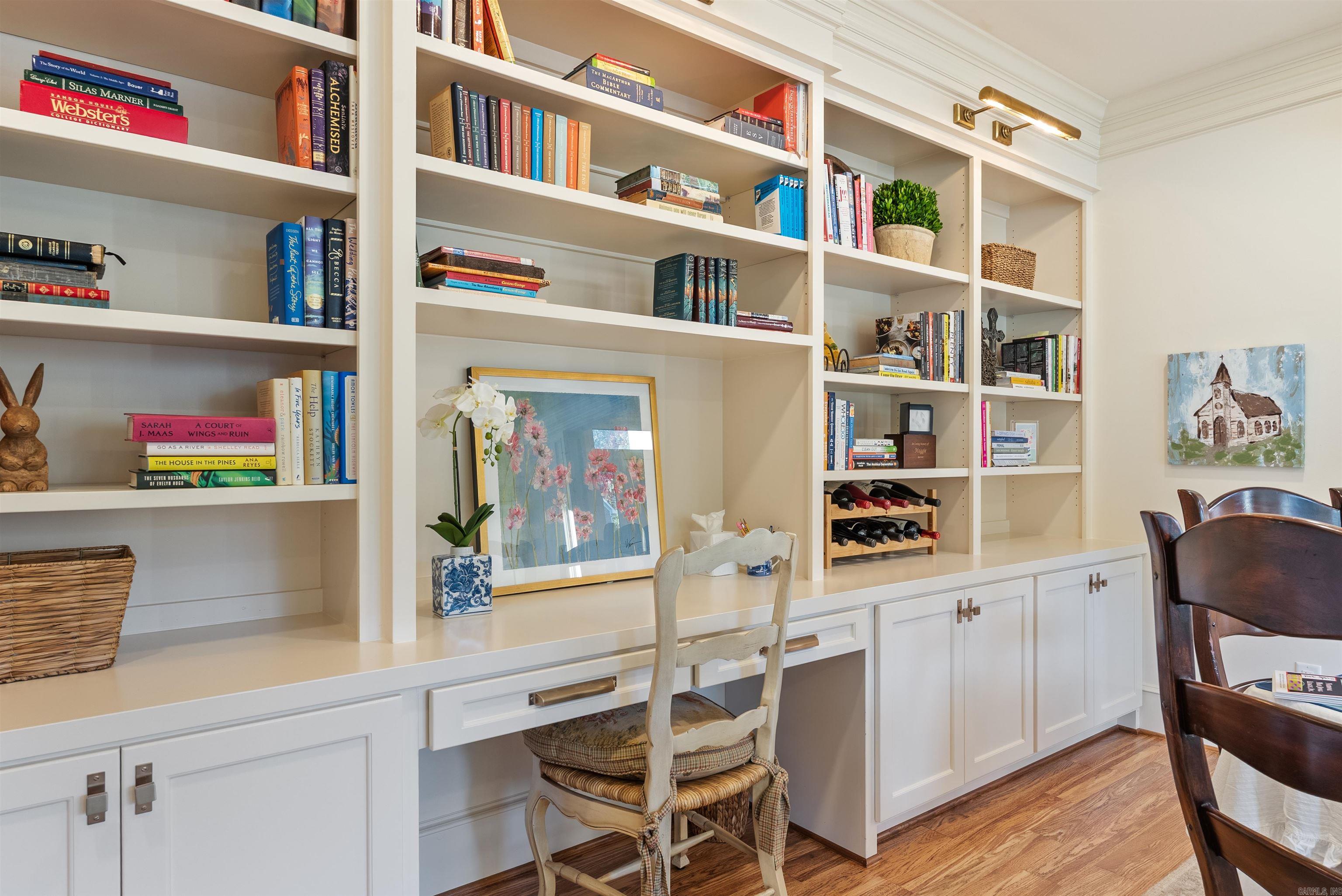 Welcome home into a beautiful, two-story foyer with refinished hardwood floors. Off the foyer is a private office featuring custom built-in bookcases and cabinetry, while the formal dining room includes a dry bar and Thermador warming drawer perfect for entertaining. The heart of the home is the two-story great room, featuring a coffered ceiling, new built-in cabinets and shelves, a wet bar with KitchenAid ice maker, and expansive views of the private backyard. In 2019, the gourmet kitchen was completely renovated with custom soft-close cabinetry, granite countertops, and stainless steel appliances including a Thermador gas range with double ovens, Sub-Zero refrigerator, dishwasher, and instant hot water. Adjacent spaces include a sunny breakfast room, a spacious sunroom, a laundry room, and a convenient pool half bath.