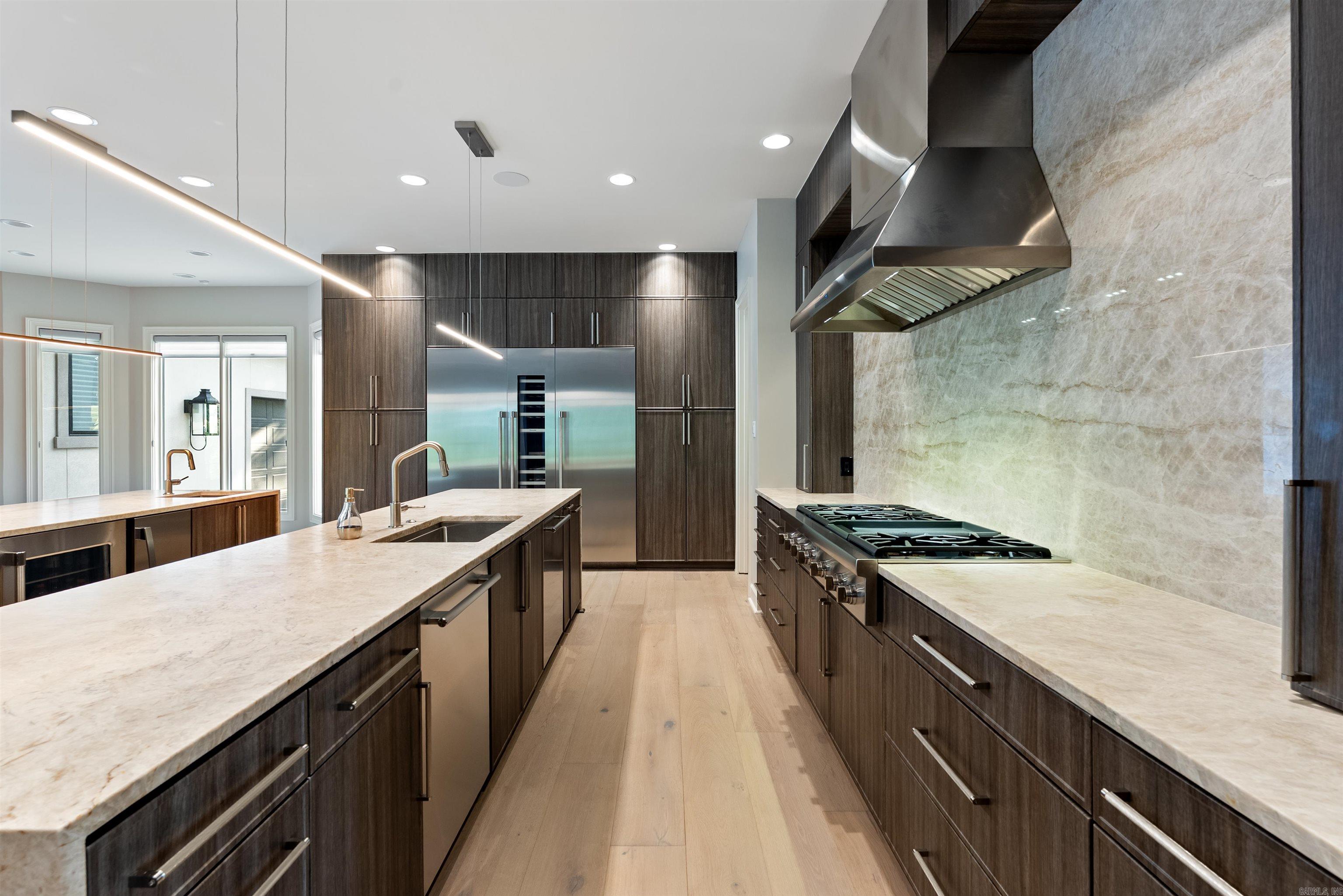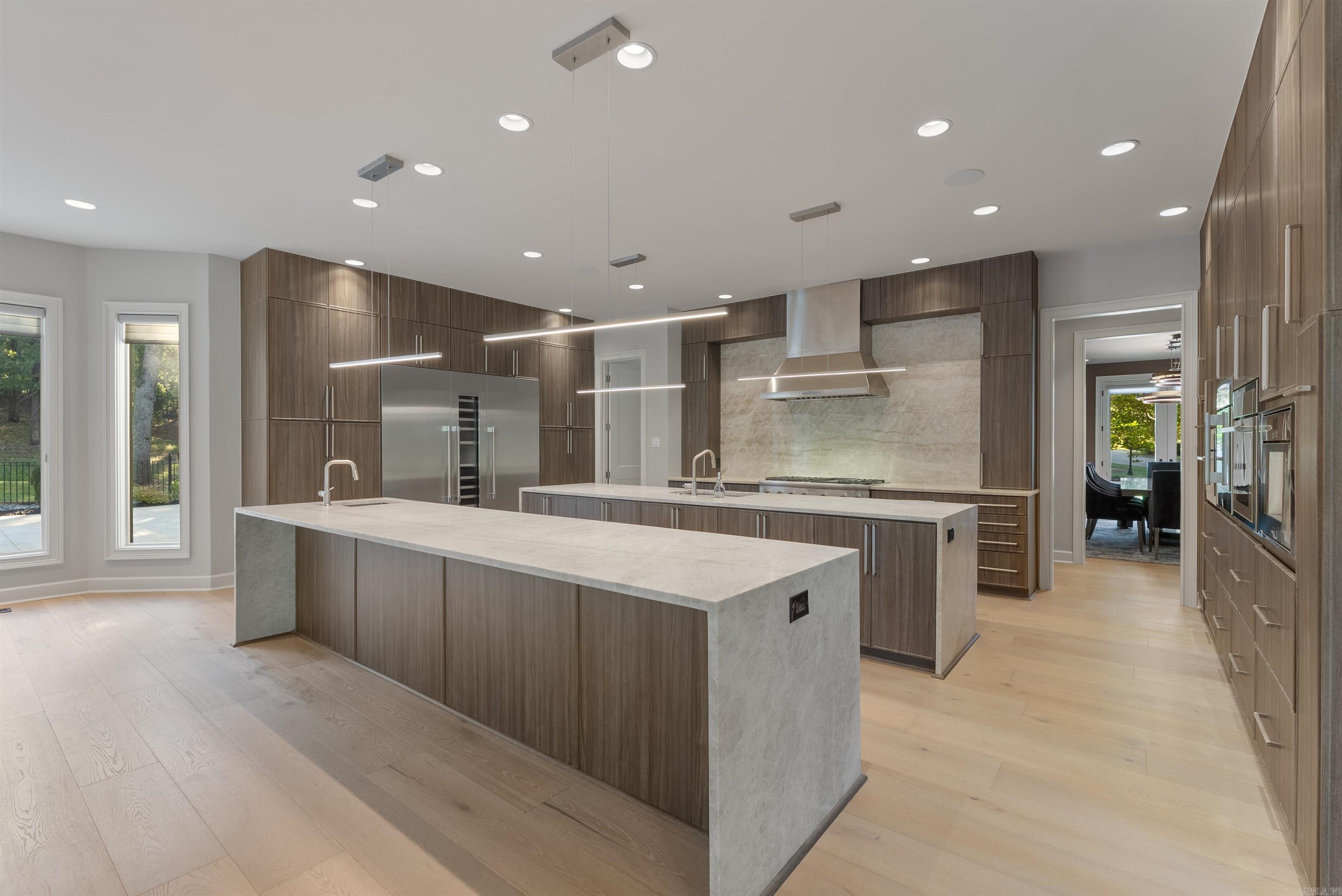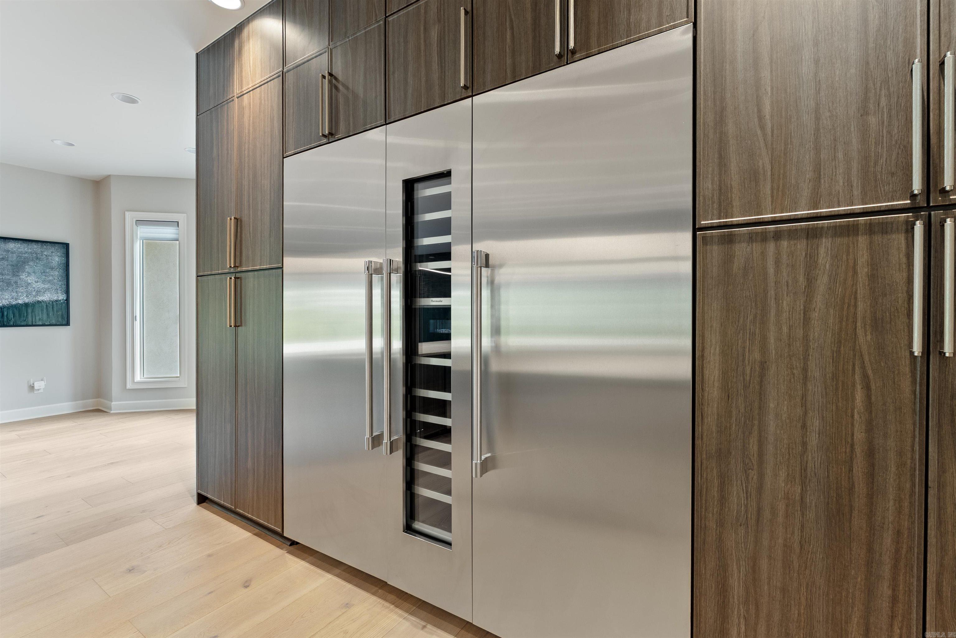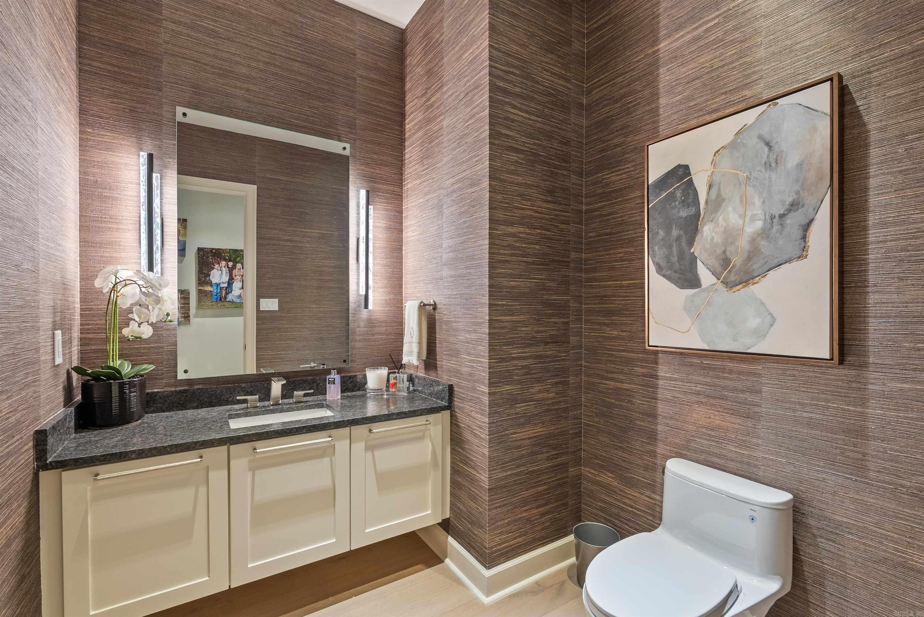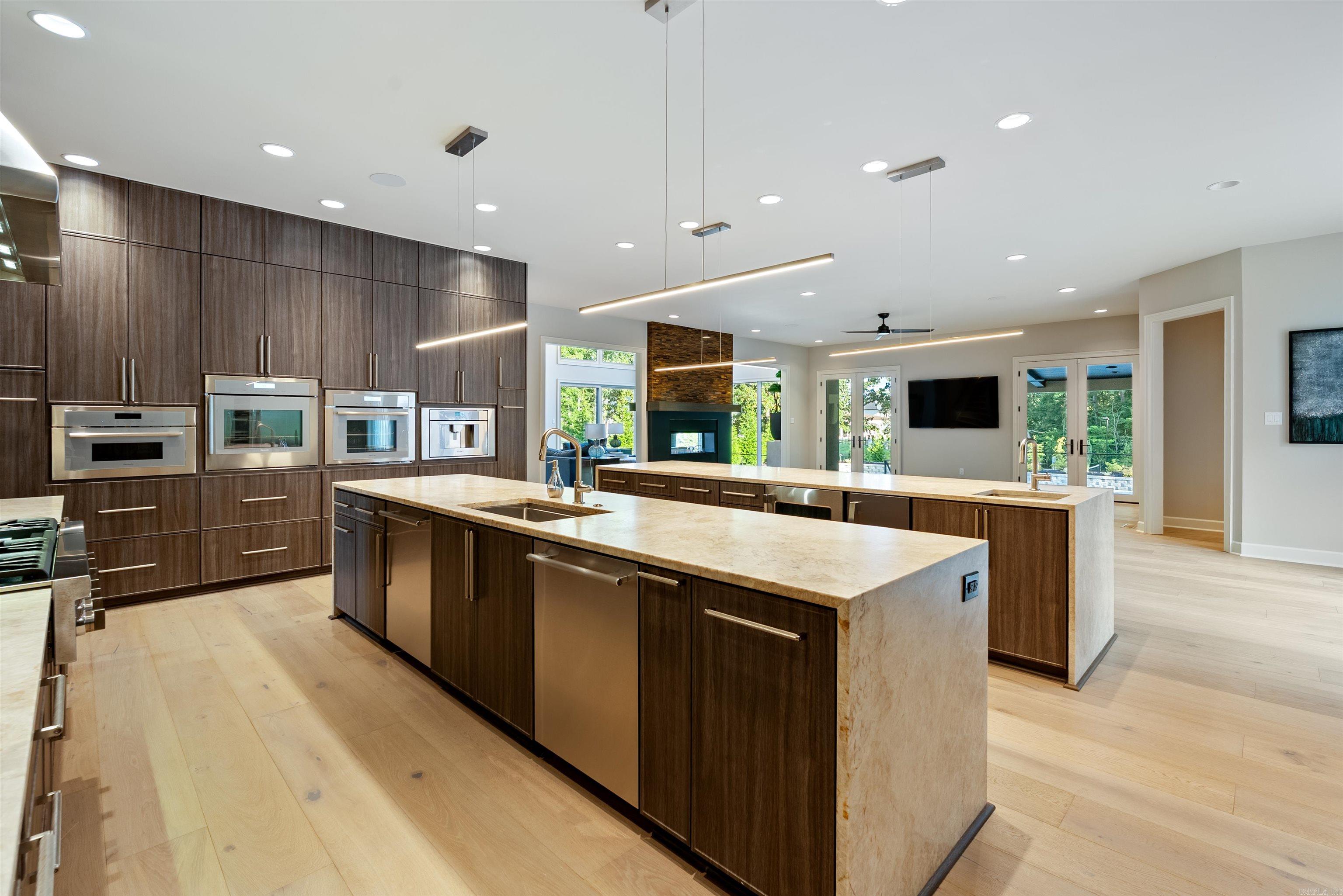 A welcoming two-story entry opens to the formal dining room and great room with expansive views of the backyard. The kitchen was designed for a chef, featuring top-of-the-line Thermador appliances: built-in coffee maker, gas range, steam and convection double ovens, convection microwave, two dishwashers, a 92-bottle dual-climate control wine tower, and the coveted Scotsman “Sonic” ice machine. The kitchen also features custom cabinets, two islands, beautiful quartzite countertops, two built-in refrigerators and a full size freezer located in the walk-in pantry completing this culinary space. The kitchen is seamlessly connected to the hearth room and breakfast area, ideal for gatherings of all sizes. The main-level primary bedroom suite is a private retreat featuring a spa-inspired bathroom with infrared sauna, dual vanities, makeup area, sitting room (or workout space), spacious closet with laundry service, and a private water closet. An additional bedroom suite with private bathroom is located on the main level offering comfort and privacy for family or guests. Ascending to the second level, you will discover four additional bedroom suites, each with its own private bathroom, ensuring every guest feels at home. The upstairs also features a game room with a wet bar, half bathroom with designer grass cloth wallpaper, home gym and a laundry room. A third laundry room is located with mud room located off of the kitchen.