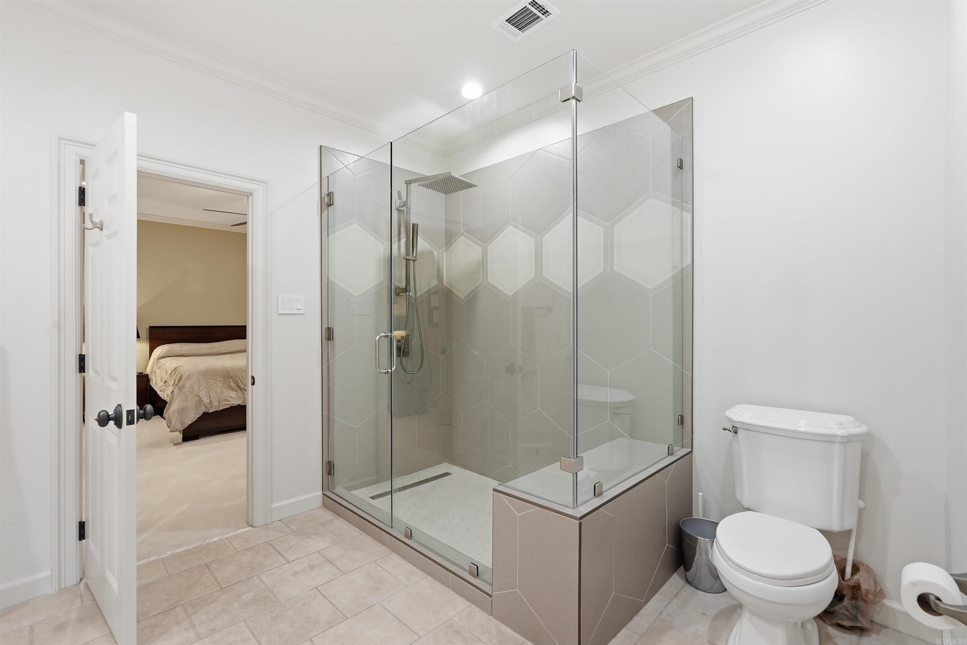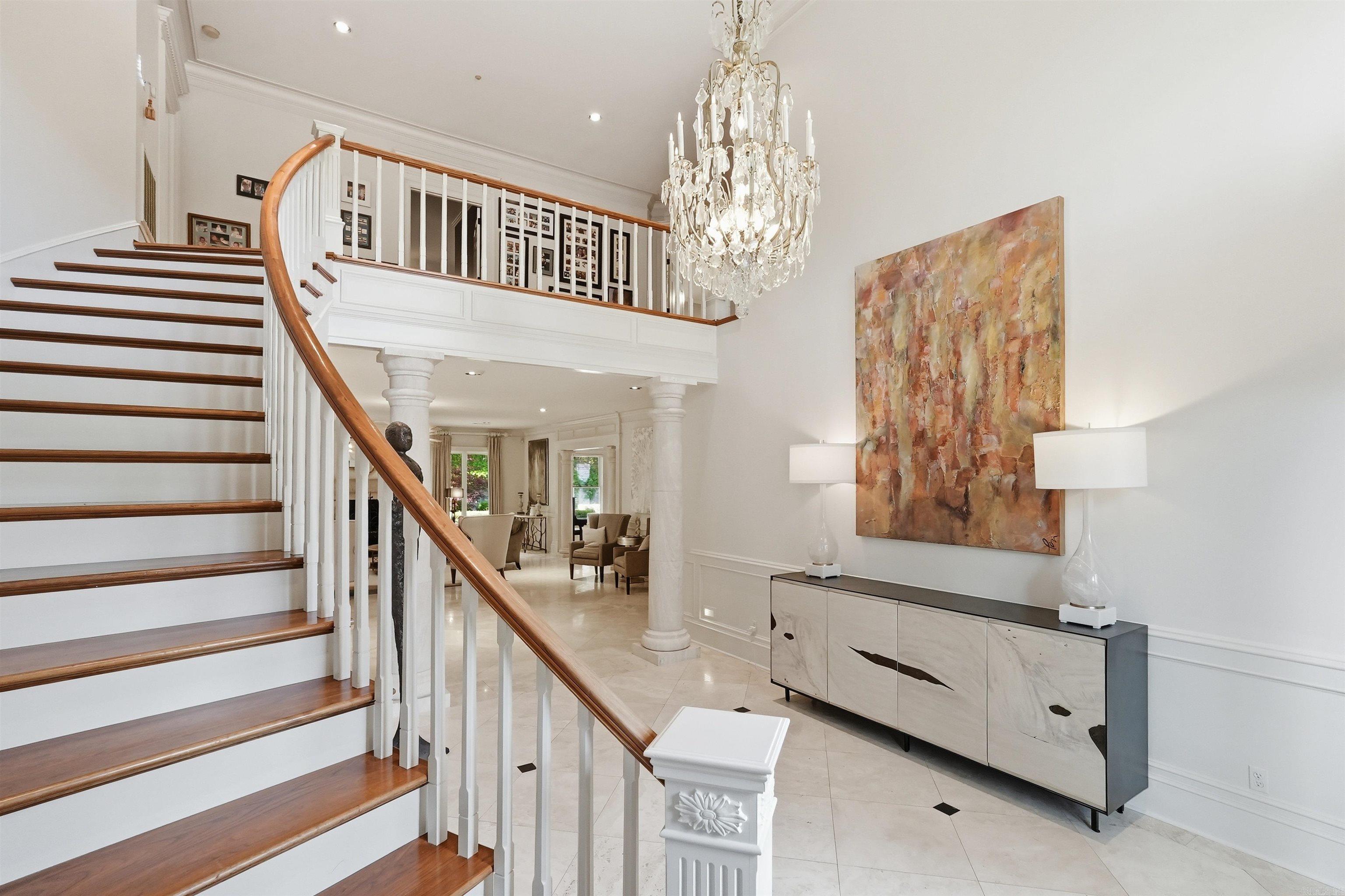 Designed with luxury and flexibility in mind, the home features two primary suites, one on the main level and one upstairs. The main-level primary suite includes new marble flooring, a spacious closet, and a beautifully renovated bath with heated floors, separate vanities with seating areas, a large shower, linen closet, and private water closet. Upstairs, there are four additional bedrooms, each with direct bath access and walk-in closets.