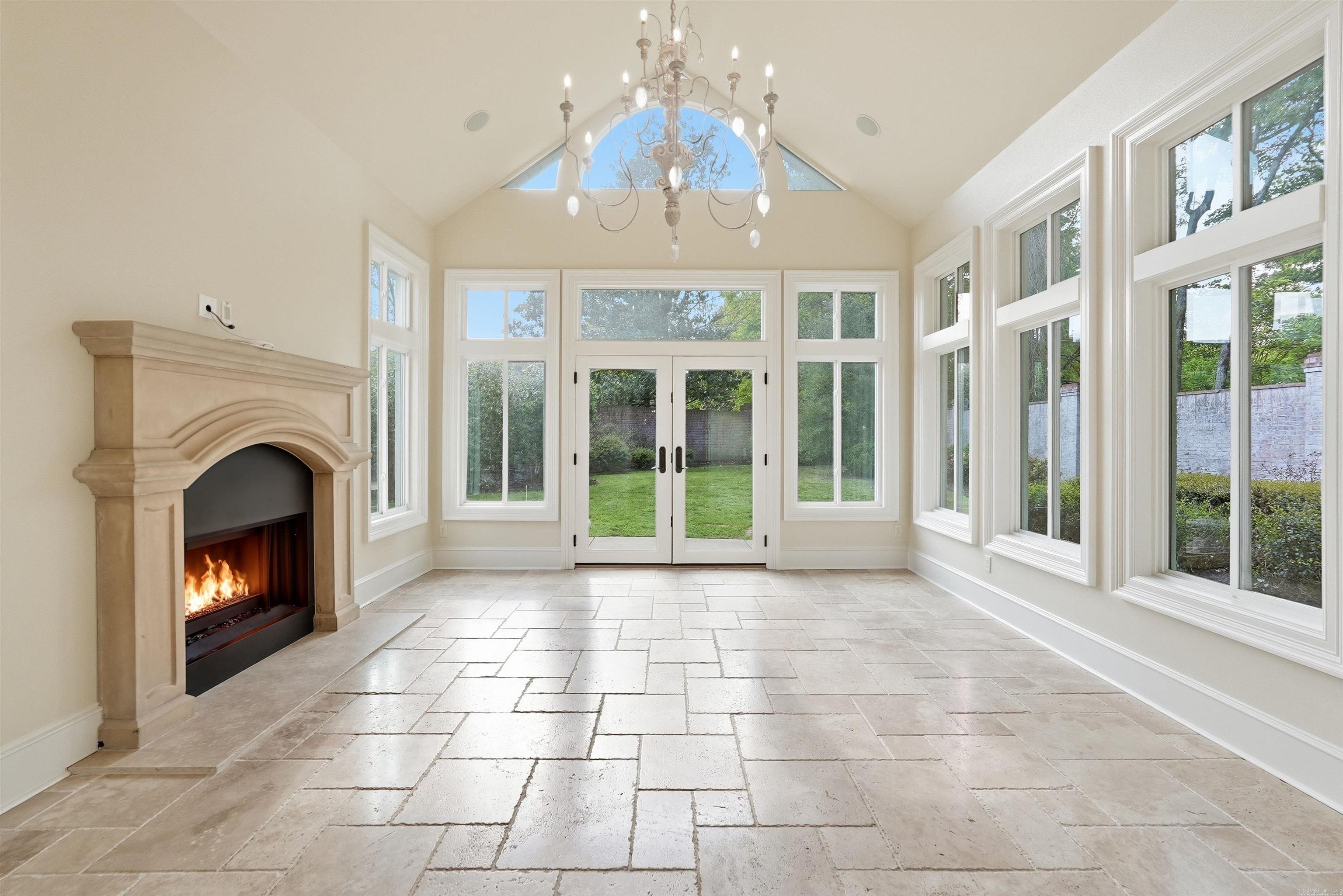 The foyer makes a dramatic first impression with its 20-foot ceiling and sweeping curved walnut staircase. The oversized great room is anchored by a fireplace with a custom hand-carved marble mantel, while the dining room is spacious enough to accommodate a banquet-size table or multiple round tables for large gatherings. The open layout is ideal for both formal entertaining and comfortable everyday living. An inviting family den just off the great room features built-in bookcases and French doors that open to the patio. The remodeled gourmet kitchen is beautifully appointed for both casual cooks and serious chefs, with new countertops, backsplash, and stainless steel appliances, including a commercial GE Monogram gas range with large oven, a convection microwave that also serves as a second oven, built-in refrigerator and freezer, microwave, and KitchenAid ice machine. Just off the dining room, a charming sunroom with its own fireplace overlooks the grounds and brick-fenced yard. Just off the dining room, is a wonderful sunroom with fireplace, overlooking the grounds and brick fence.