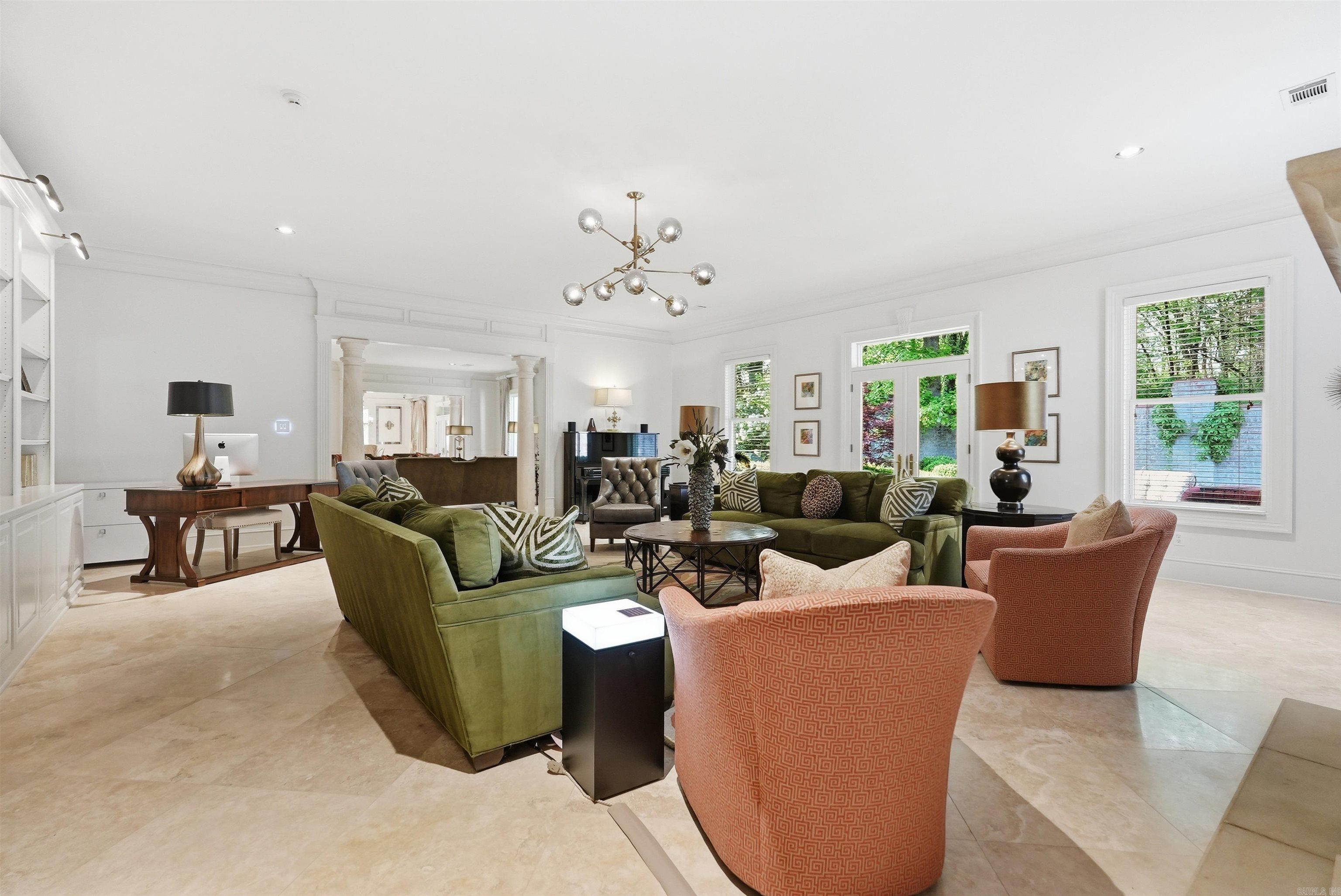 Additional amenities include marble floors, a slate-look 50-year architectural roof replaced in 2012, eight-foot solid doors, custom window treatments, fresh interior paint, and a three-car side-loading garage accessed from a gated drive with new garage door openers. The side and rear yard are enclosed by a brick fence and offer ample space for a pool. This is truly a special home.