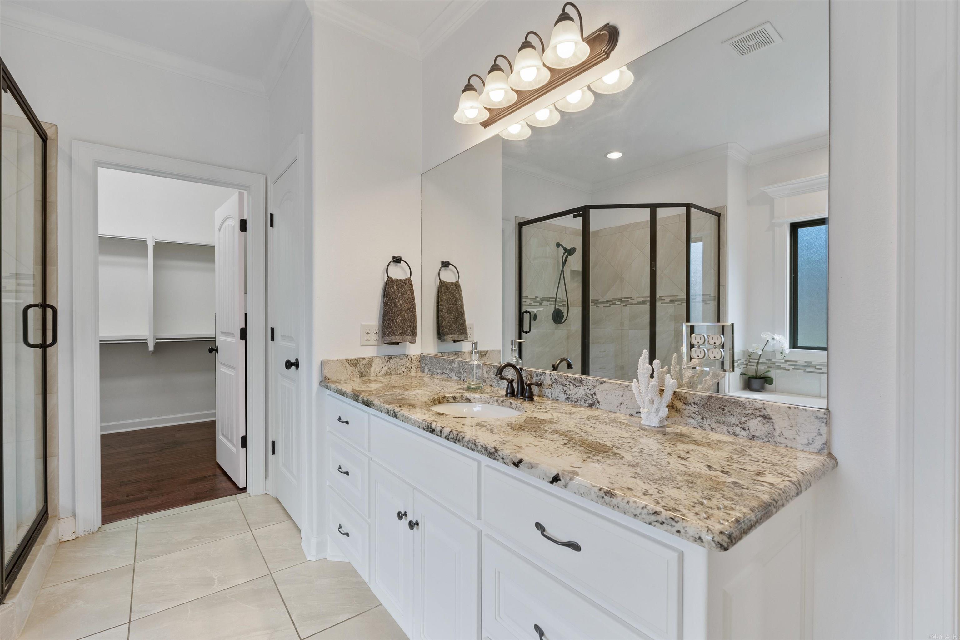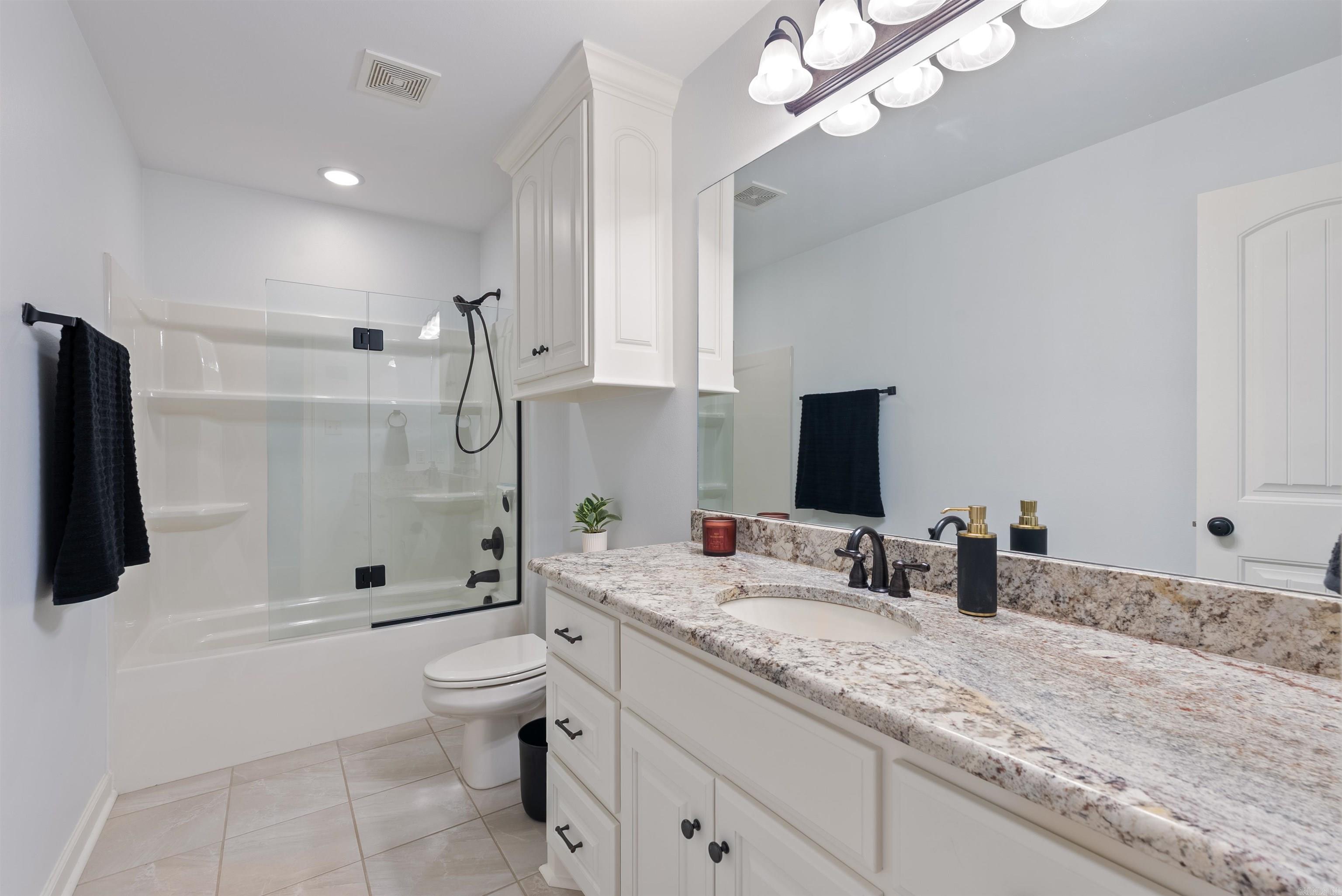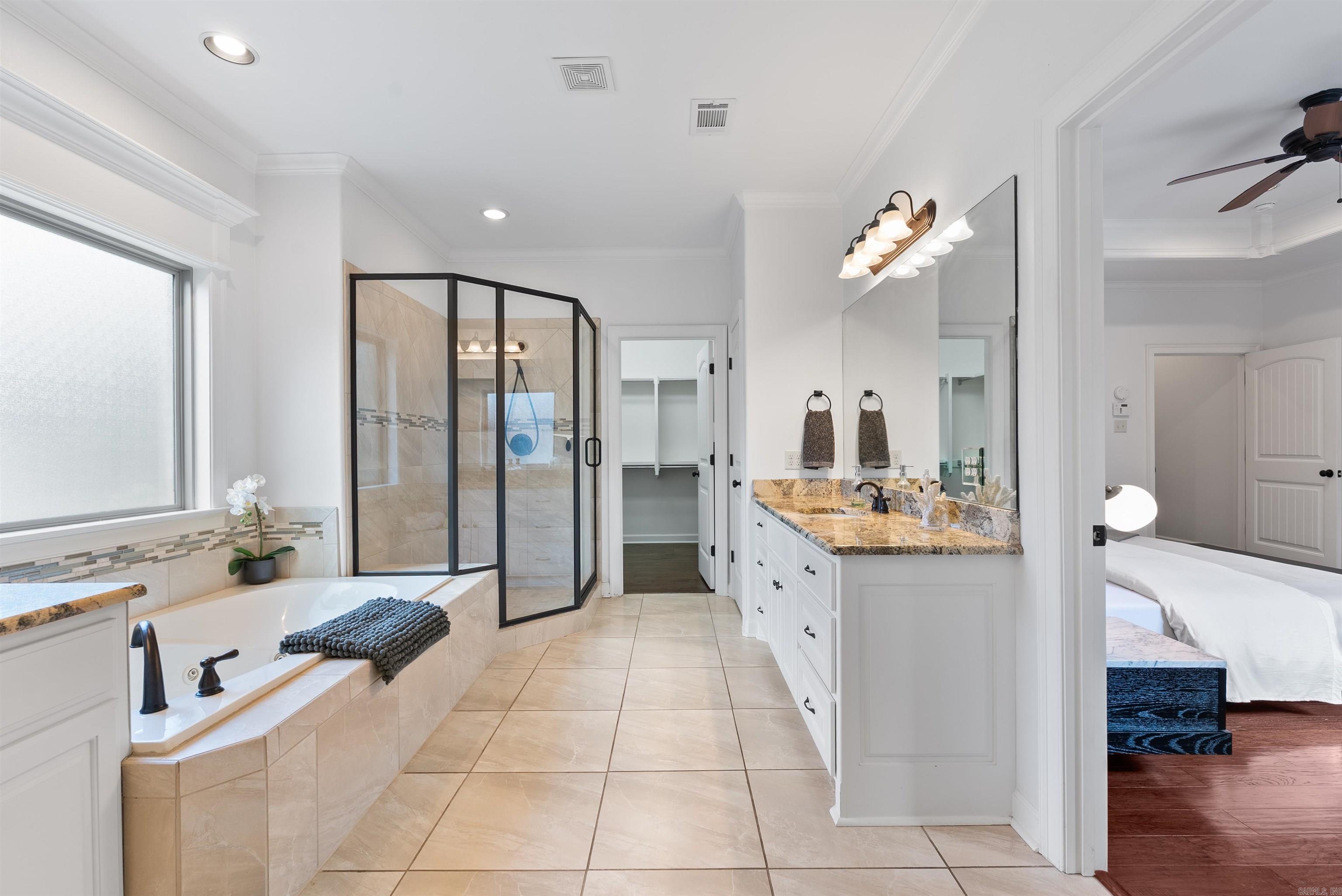 The expansive main-level primary suite offers direct patio access and includes a spa-like bathroom with double vanities, a jetted tub, walk-in shower, and dual closets—one of which includes a FEMA-rated safe room. The main level also includes a guest suite with a private bath, two additional bedrooms with a shared full bath with dual sinks. Also featured is a laundry room and a mud room offering everyday functionality and organization. Upstairs, you’ll find a flexible layout with a built-in study nook, a spacious fifth bedroom, a large game room, a full hall bathroom and walk-in attic space with storage.