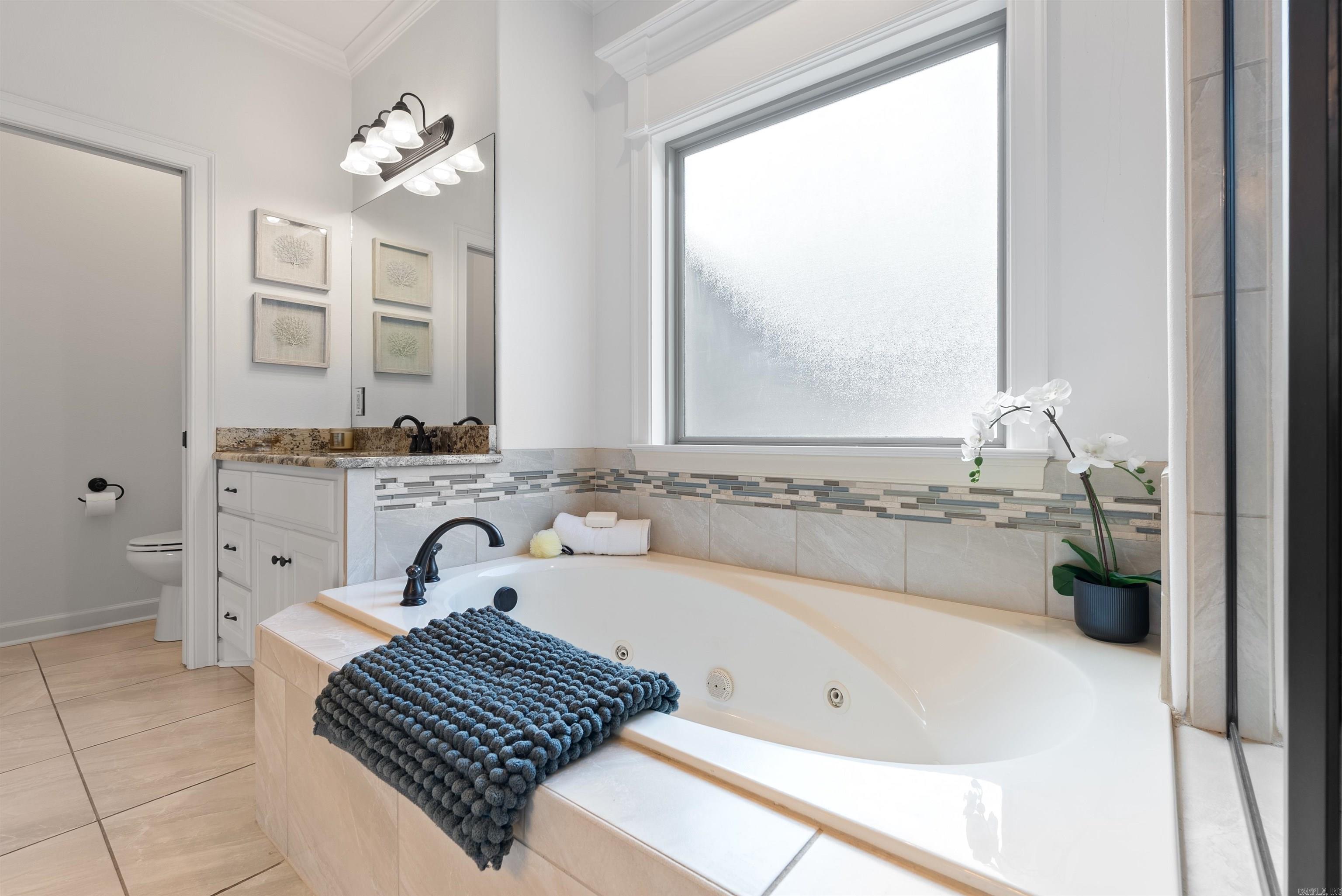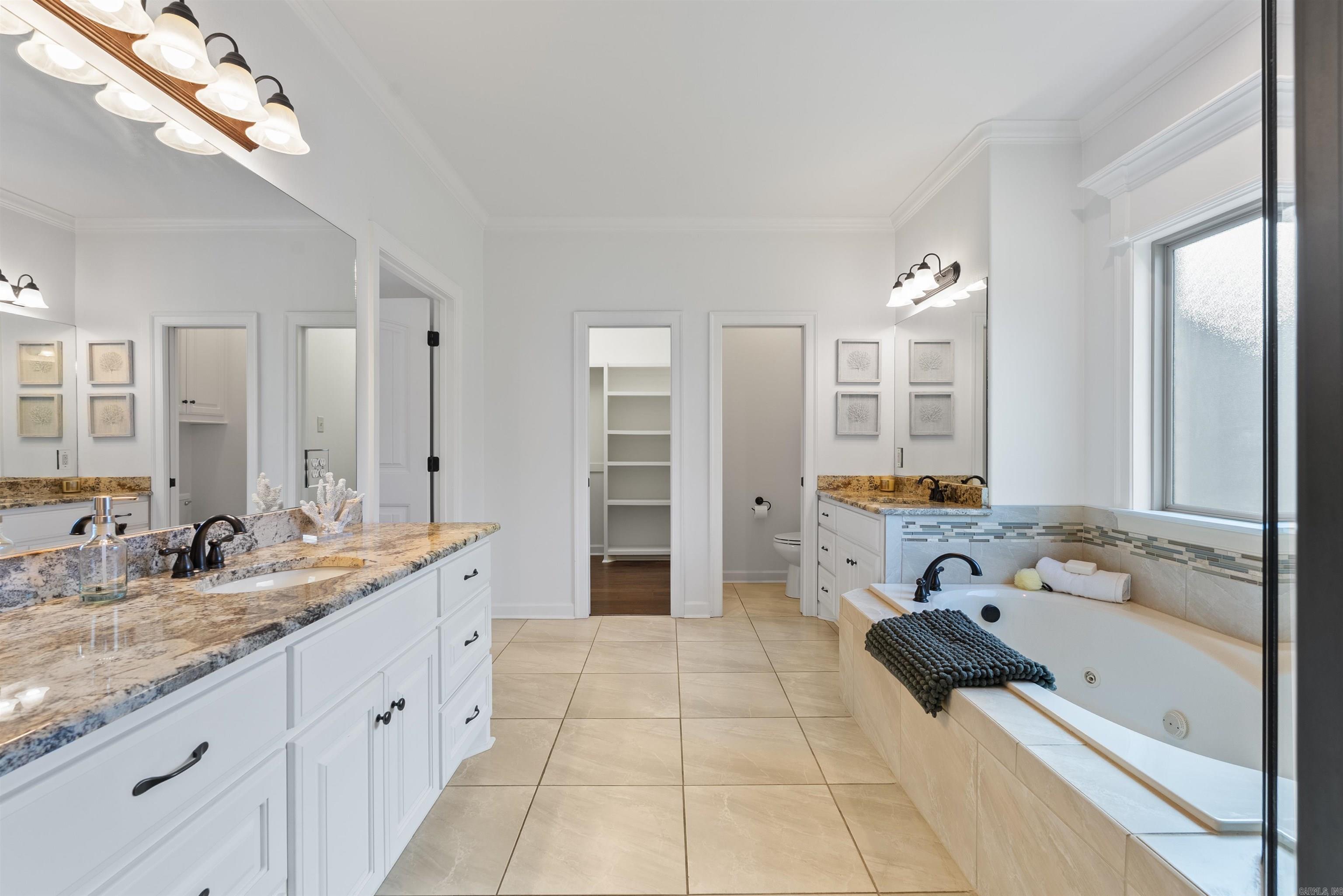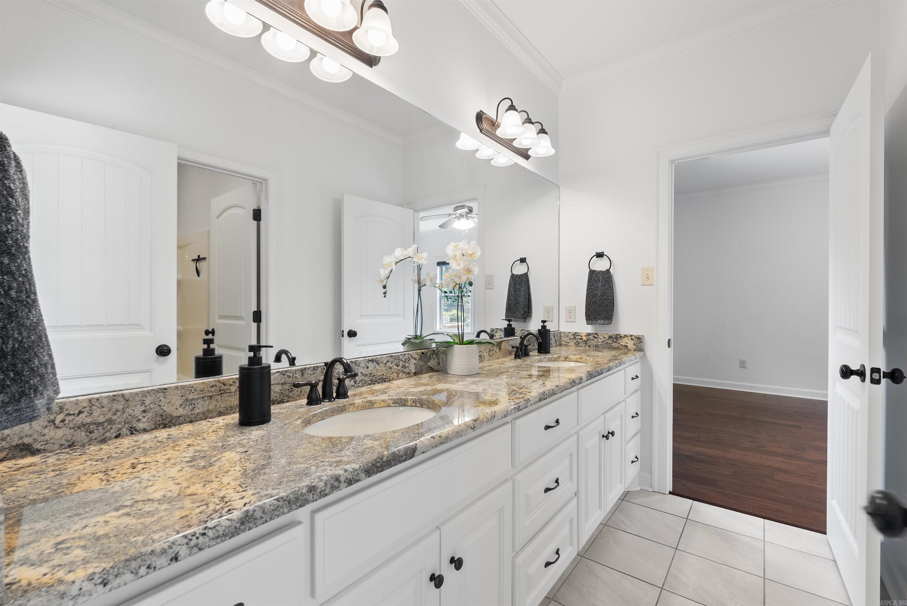 The expansive main-level primary suite offers direct patio access and includes a spa-like bathroom with double vanities, a jetted tub, walk-in shower, and dual closets—one of which includes a FEMA-rated safe room. The main level also includes a guest suite with a private bath, two additional bedrooms with a shared full bath with dual sinks. Also featured is a laundry room and a mud room offering everyday functionality and organization. Upstairs, you’ll find a flexible layout with a built-in study nook, a spacious fifth bedroom, a large game room, a full hall bathroom and walk-in attic space with storage.