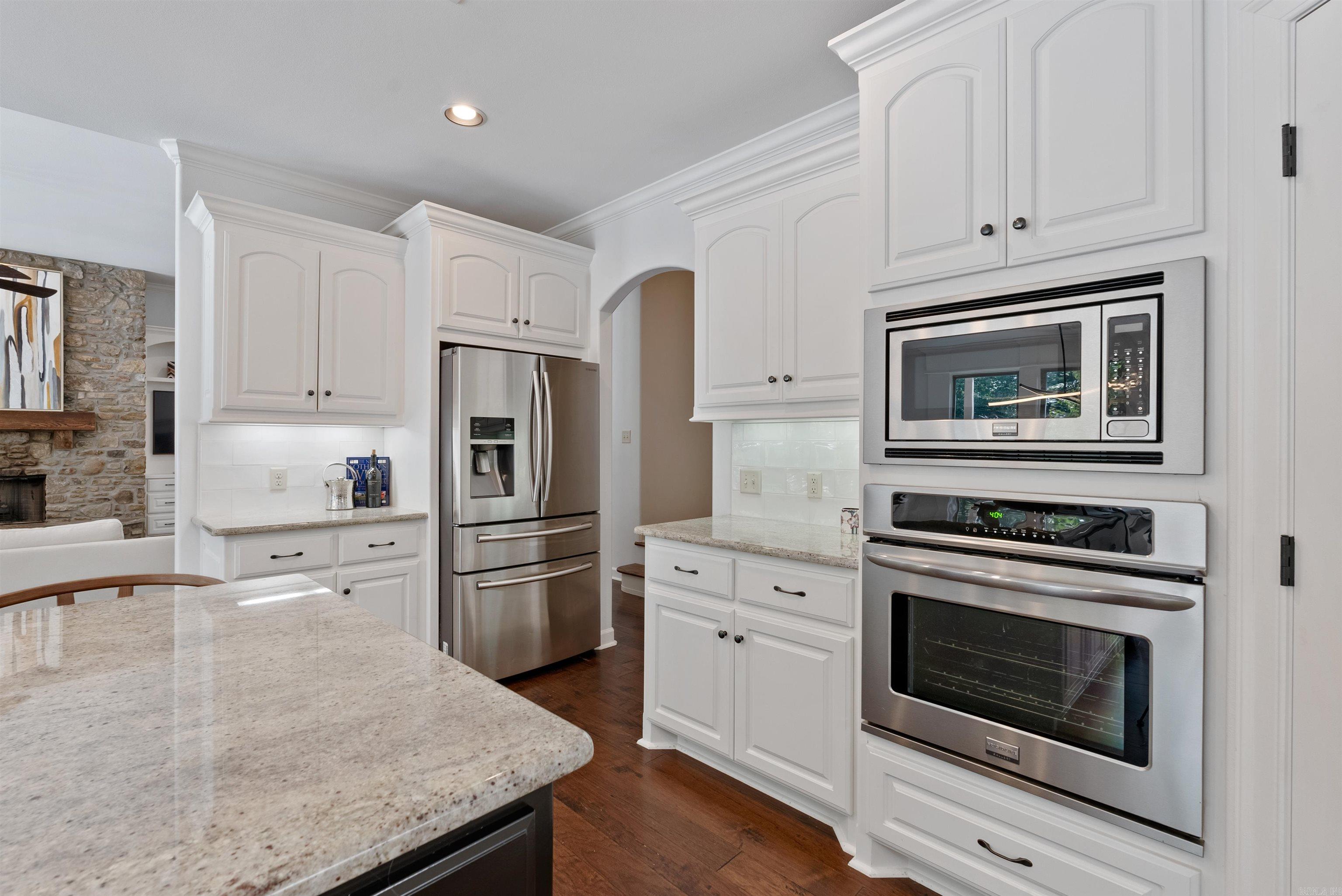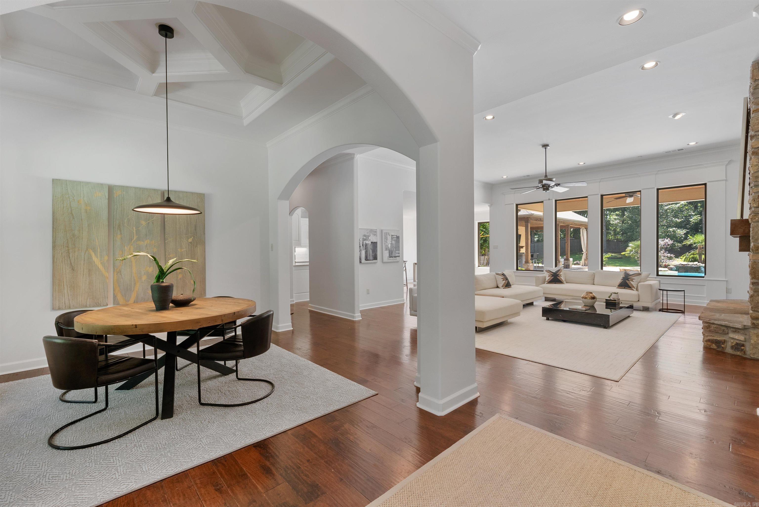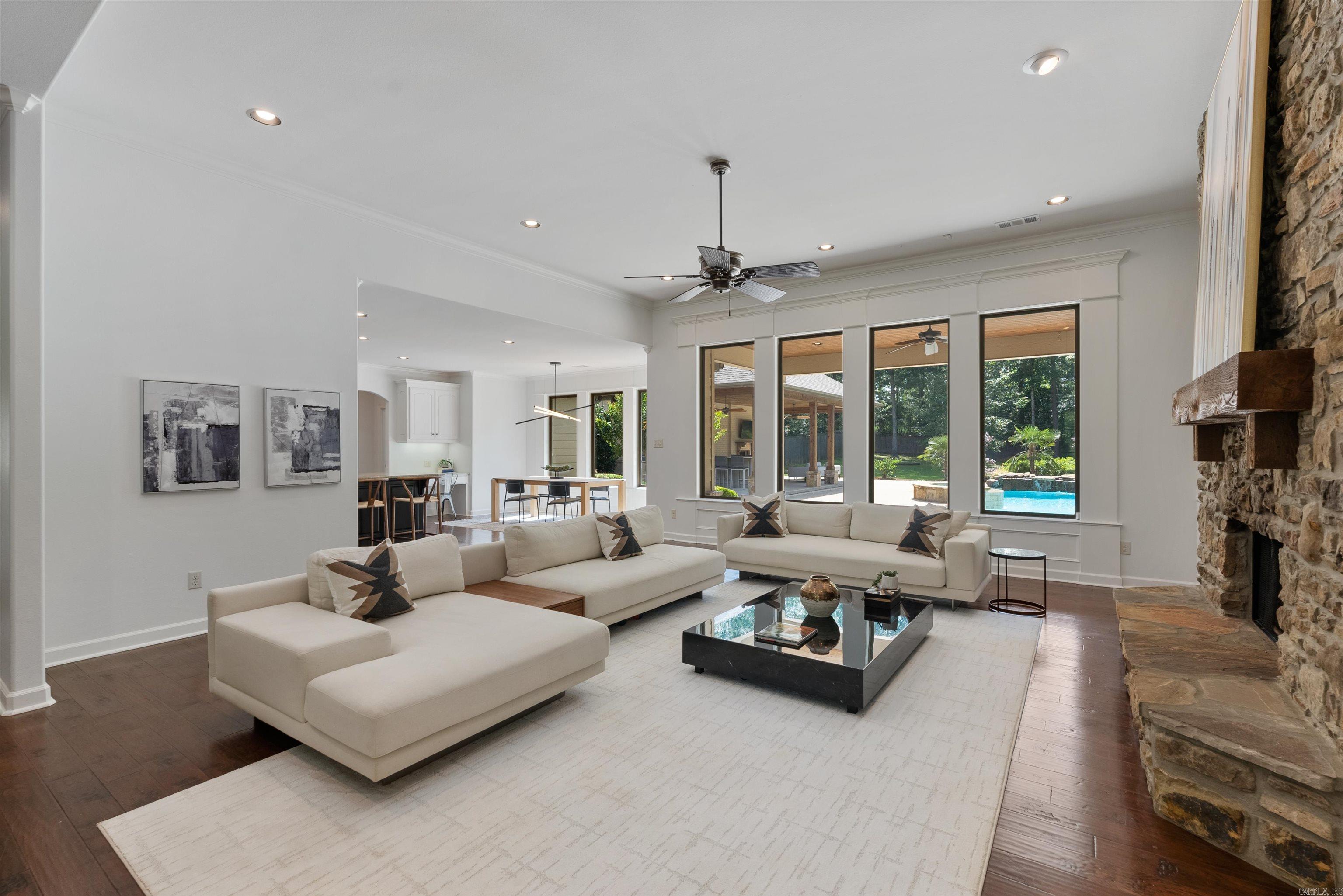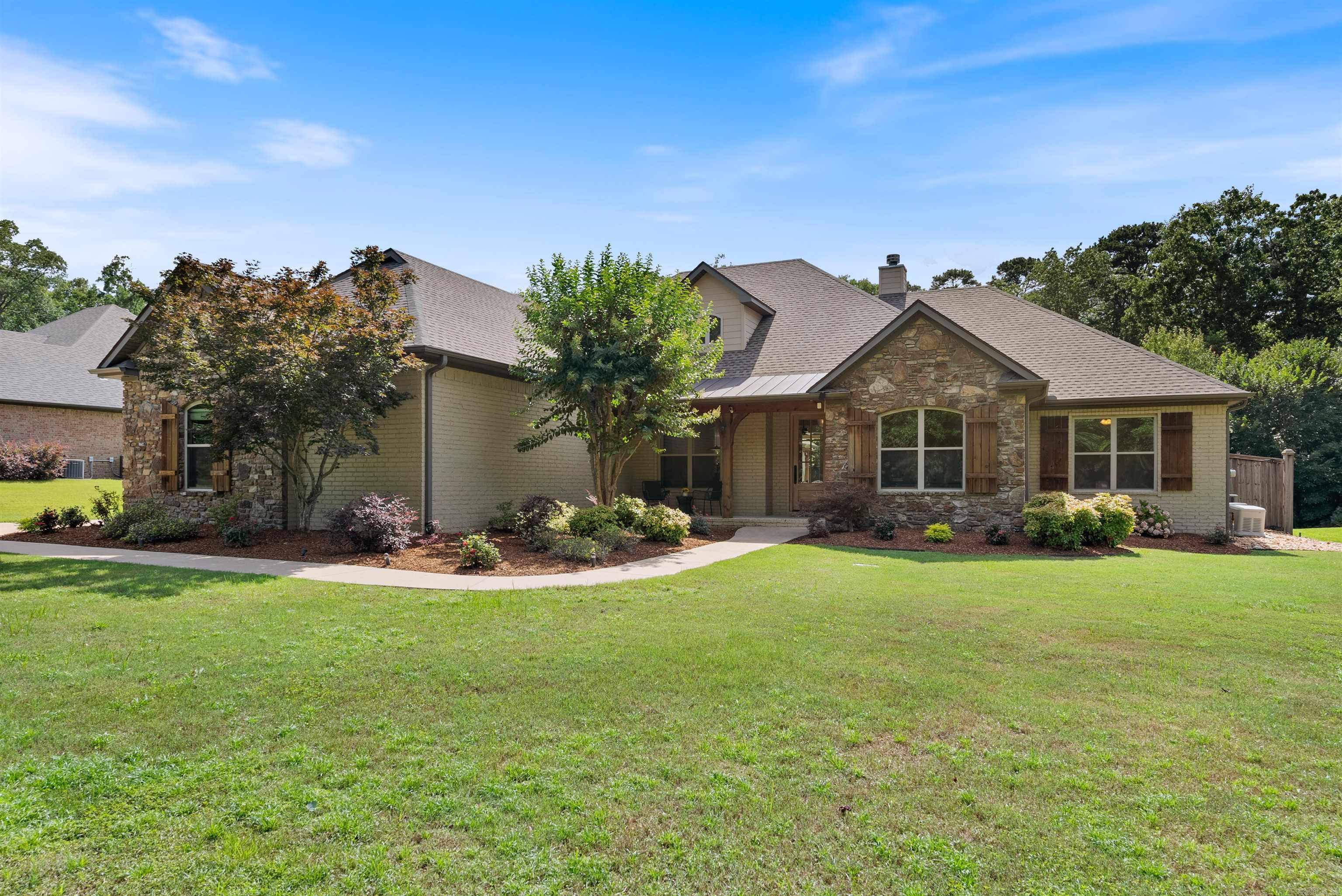 Tucked down a long private drive, this picturesque home welcomes you with handsome curb appeal, painted brick accented by Arkansas natural stone, and a charming front porch that invites you to slow down and stay awhile. Inside, the open-concept floor plan features an office with French doors, a formal dining room with a beautiful coffered ceilings which transitions seamlessly into the great room. The spacious great room offers a stone fireplace, custom built-in shelving and cabinets, and windows with incredible natural light that frame the view of the backyard oasis. The gourmet kitchen is open to the great room designed for entertaining and everyday living—complete with a center island with barstool seating, granite countertops, new backsplash, new dishwasher, gas cooktop, wall oven, microwave, refrigerator, built-in desk, walk-in pantry, and a sunny breakfast room.