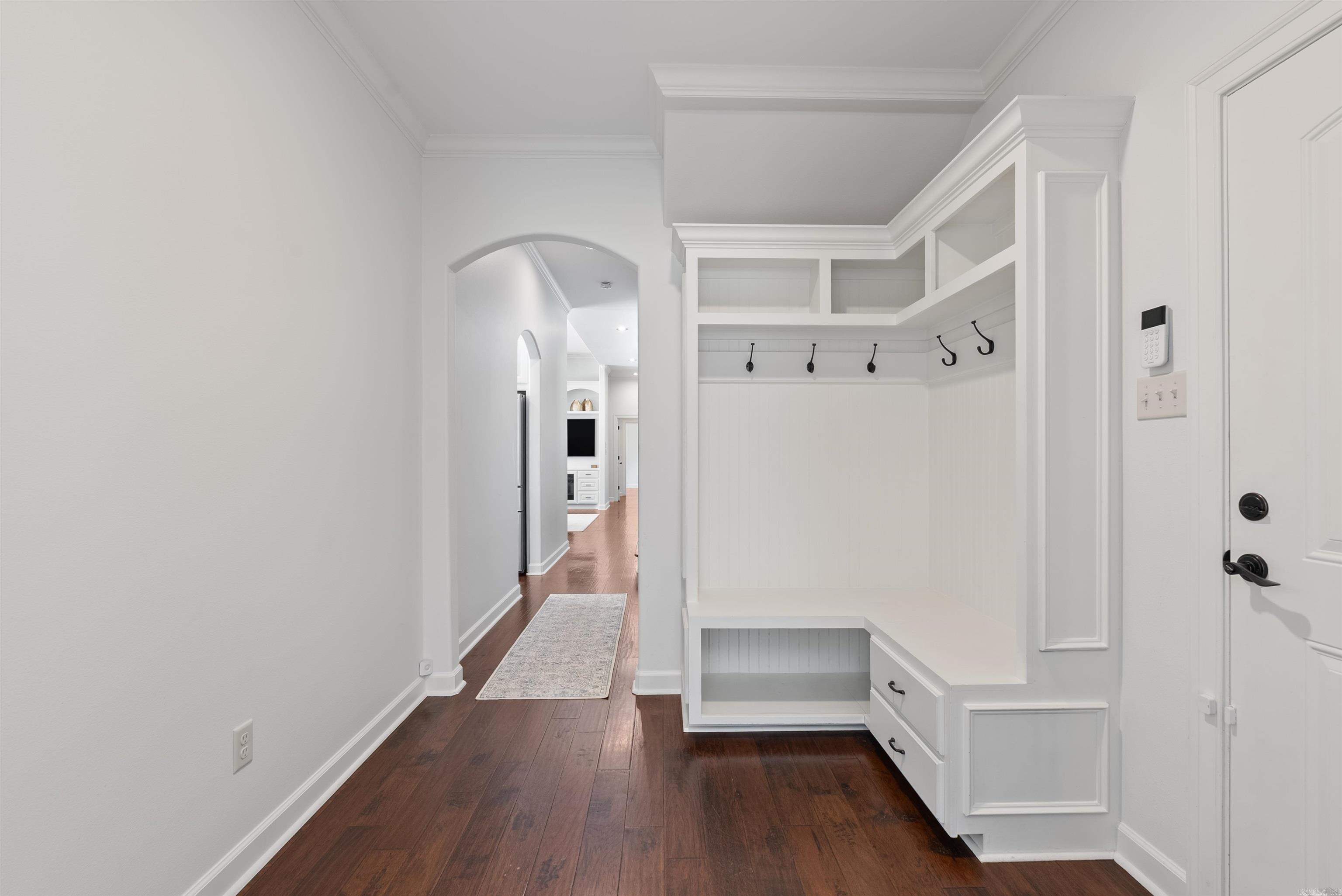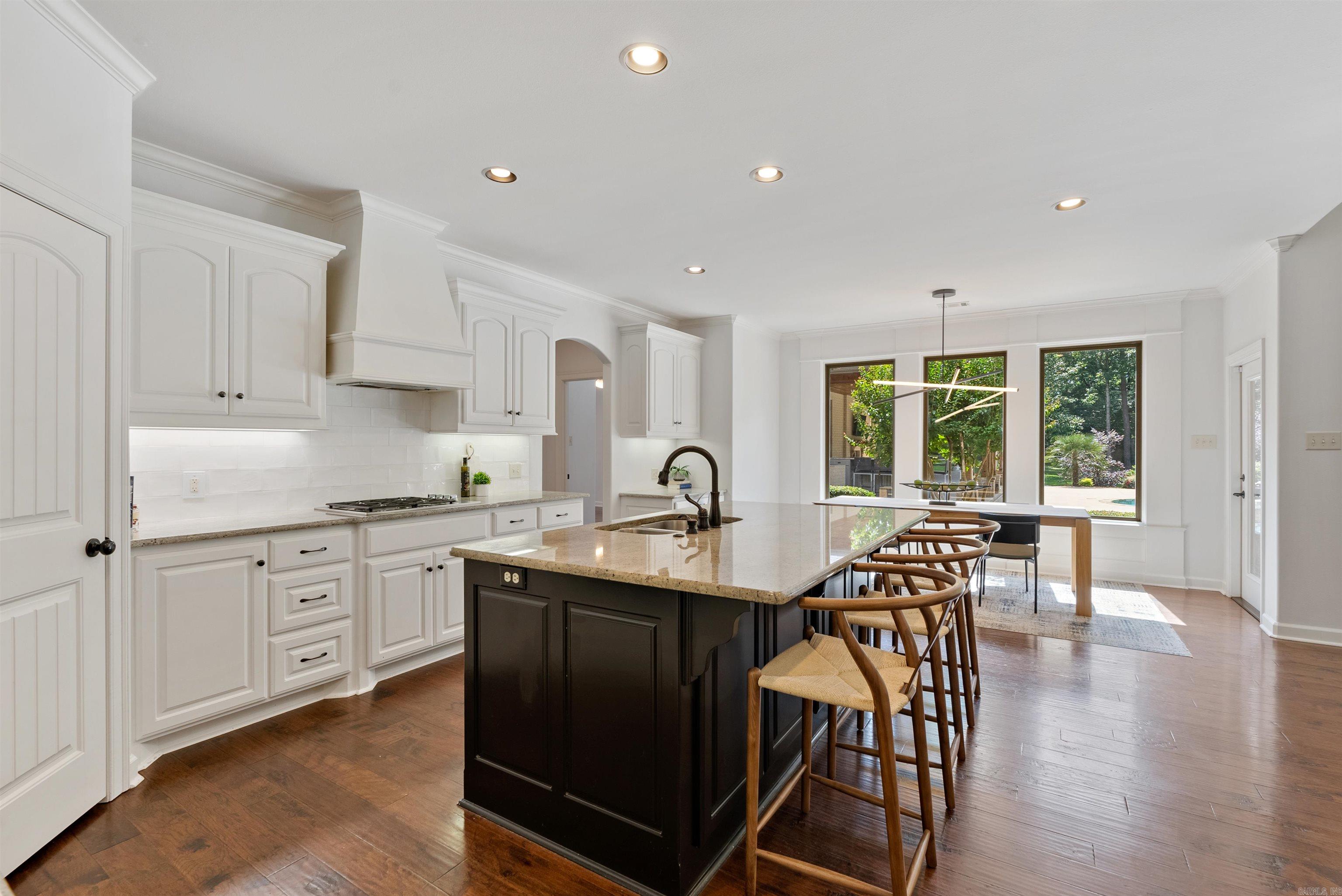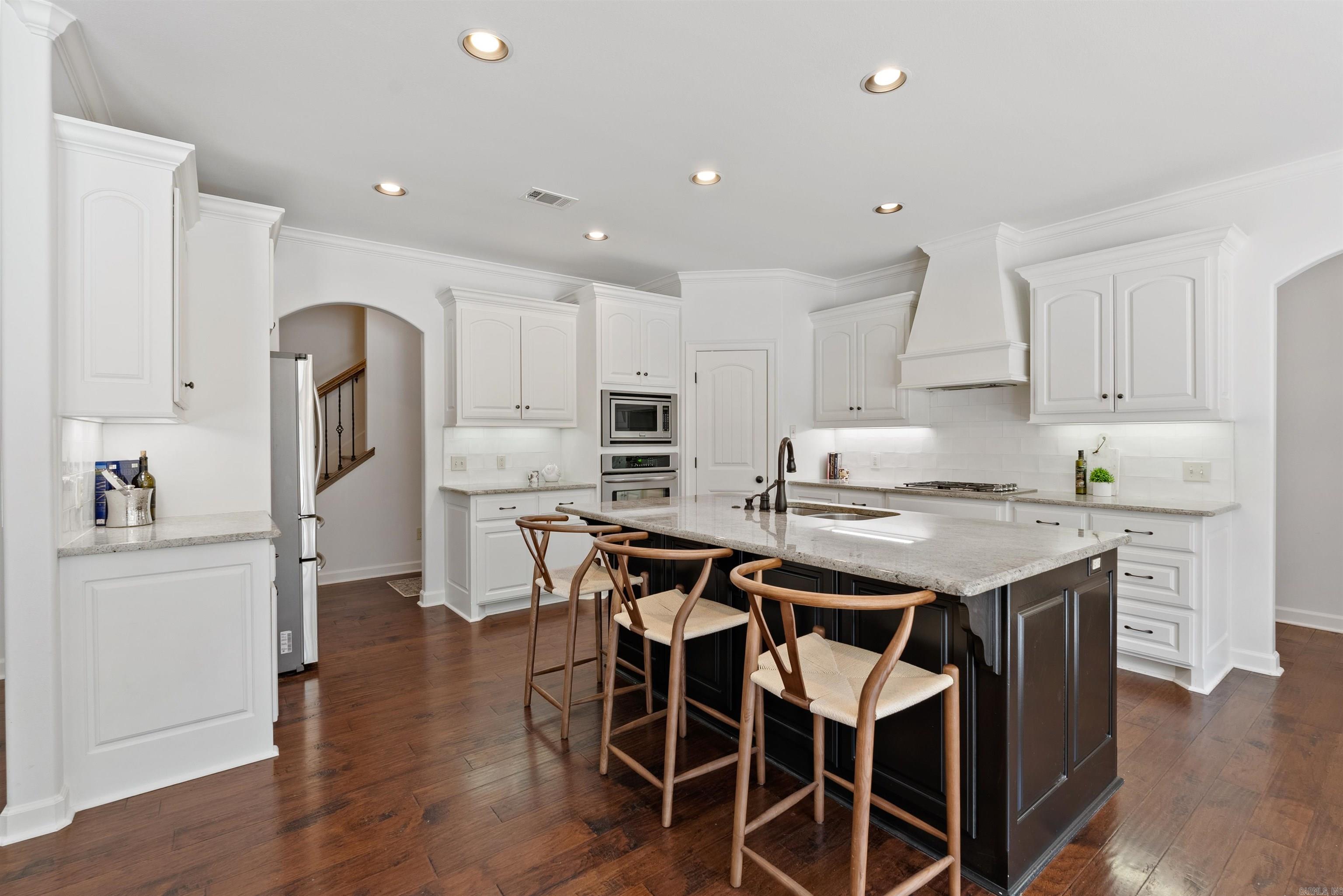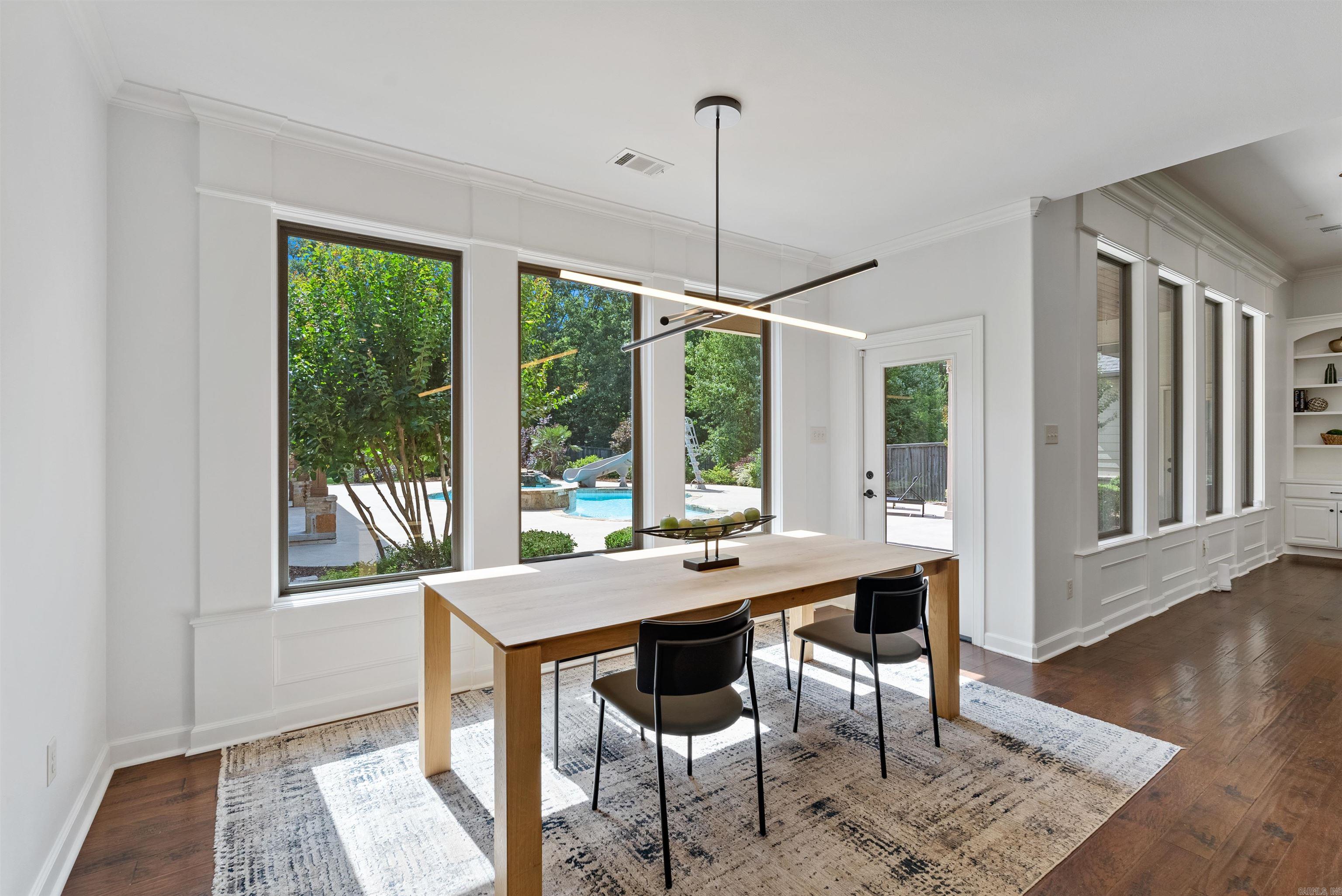 Tucked down a long private drive, this picturesque home welcomes you with handsome curb appeal, painted brick accented by Arkansas natural stone, and a charming front porch that invites you to slow down and stay awhile. Inside, the open-concept floor plan features an office with French doors, a formal dining room with a beautiful coffered ceilings which transitions seamlessly into the great room. The spacious great room offers a stone fireplace, custom built-in shelving and cabinets, and windows with incredible natural light that frame the view of the backyard oasis. The gourmet kitchen is open to the great room designed for entertaining and everyday living—complete with a center island with barstool seating, granite countertops, new backsplash, new dishwasher, gas cooktop, wall oven, microwave, refrigerator, built-in desk, walk-in pantry, and a sunny breakfast room.