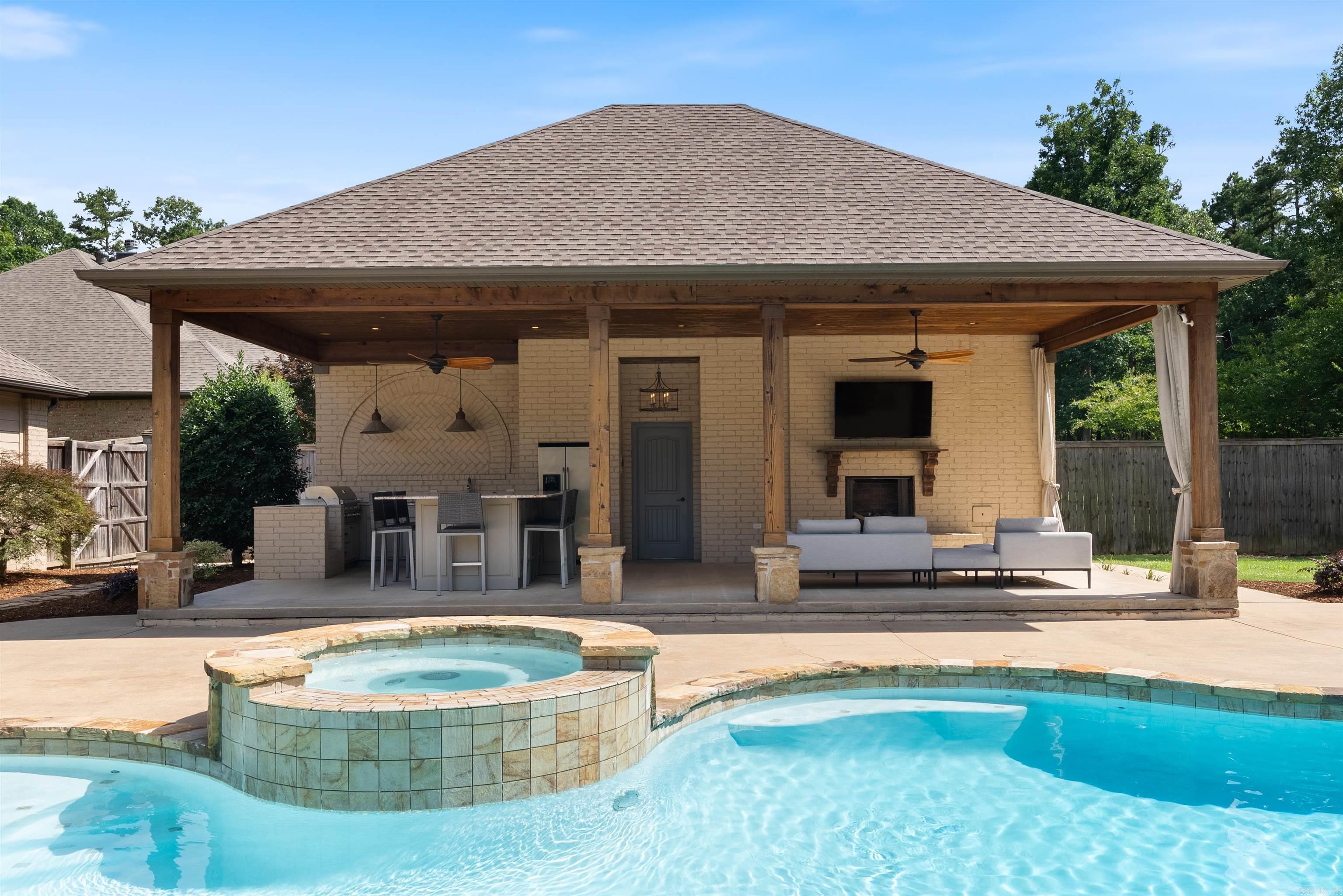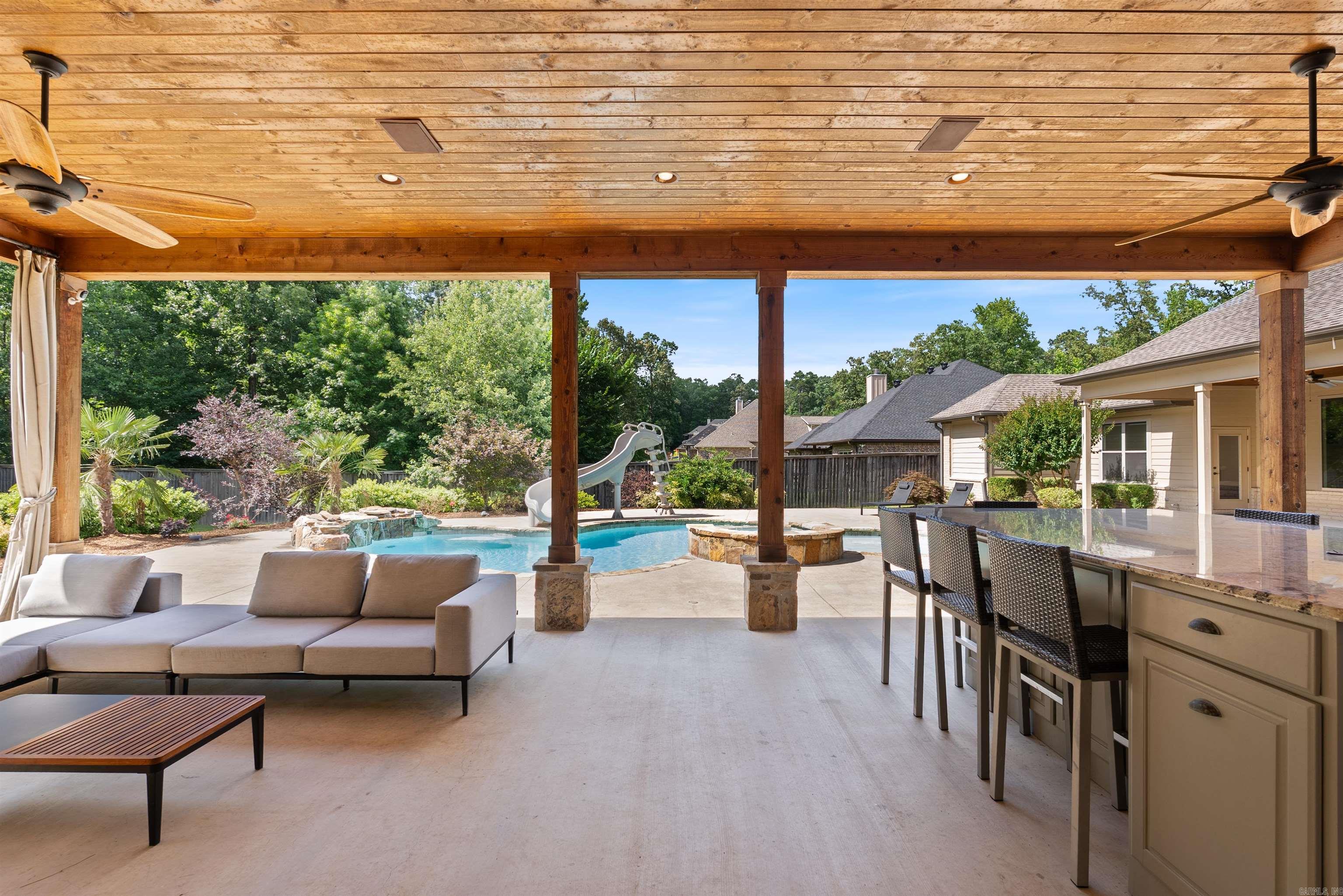 Designed for both relaxation and unforgettable gatherings, this resort-style outdoor space includes a covered patio, saltwater pool with water slide, heated spa, and a cabana with a private half bath, storage, and roll up garage door—perfect for a 4-wheeler or golf cart. The fully equipped outdoor kitchen—complete with dining area—is perfect for year-round entertaining under the shade of surrounding trees. Additional features include fresh interior paint, new hardwood floors, energy-efficient windows, a three-car garage, irrigation system, alarm system, exterior surveillance, and a whole-home generator.